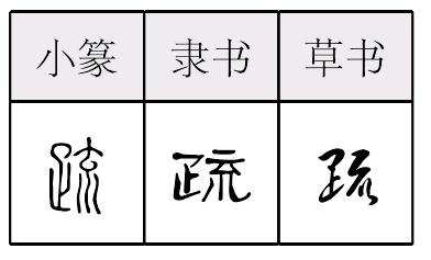 【提示】在异体字整理前,表示 “疏通”“分散” “间距大或空隙大”“关系远或不亲密” “不熟悉” “空虚”“粗心大意” 等义时,疎是“疏” 的异体; 表示 “古代官员向君主分条陈说事情的文字” 和 “古书中比‘注’ 更详细的注解” 义时,“疏” 没有异体。止,位于字左时,末笔的横改提。㐬, 7画, 不要错写成6画的巟。 *疏〔疎〕shū12画 疋部 (1) 使畅通: ~导|~通。 (2) 事物之间距离远、空隙大(与“密”相对): ~落|~松|稀~。 (3) 关系远;不亲近或不熟悉: ~远|生~|亲~。 (4) 粗略;不细密: ~漏|~忽|~于防范。 (5) 空虚;浅薄: 空~|志大才~。 (6) 分散;使密变稀: ~散|仗义~财。 (7) 封建时代臣子向君主分条陈述事情的文字: 上~|奏~。 (8) 指为古书旧注所作的阐释或进一步发挥的文字: 注~。 疏 ☚ 育 丑部 ☛ 疏疎shū《说文》小篆作疋(shū)。疋即足字的变形和变音。可能象五趾疏散的疏的音义。小篆又作疏。 是小篆以来的形声字。 从㐬[tū,倒㜽,即倒“子”(tū)的古文又作疏。《说文》说“不顺忽出”义。即生孩子],从疋(本是shū,足字的变形和变音。现作匹的异体字,见《异体字表》),疋亦声。指去掉阻塞使畅通。如:疏导。中古又造疎字,从疋、束声,现作异体字。见《异体字表》。引申为分散。如:疏散。又指事物间距离大,空隙大。跟“密”相反。如:疏林。组词如:疏密|稀疏。引申为不亲密。组词如:亲疏|疏远。又不细密,粗心。如:疏神|疏忽。又空虚。如:志大才疏。又粗。如:疏食。又不熟悉。如:人生地疏。组词如:生疏。转为名词,指分条说明的文字。如:注疏|奏疏(指封建时代臣下向皇帝陈述事情的文章)。 疏疎★异◎异★常◎常