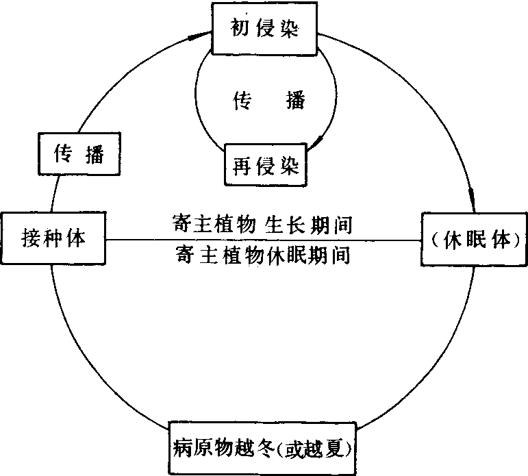 病害循环disease cycle又称侵染循环、侵染链。一种病害从寄主的上一个生长季节开始发生,到下一个生长季节再度发生的过程。病害循环包括3个主要环节: |