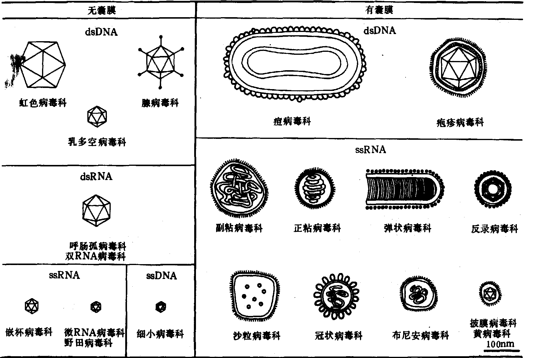 脊椎动物的病毒各科 在感染脊椎动物的病毒中得到病毒分类和命名委员会承认的有19个科,其中DNA病毒有6科,RNA病毒有13科(表1)。科以下设属,有些在科与属之间还设亚科。科、亚科和大部分属均有学名,少数属尚用俗名。近年来有些学者把部分未分类和新发现的病毒设立新科,如嗜肝病毒科和凸隆病毒科等。 节肢动物病毒各科 已知有11个科的病毒能感染节肢动物,主要为昆虫。其中9个科的某些属感染脊椎动物。不少成员既感染吸血节肢动物,又感染脊椎动物。在前者中呈隐性感染,侵入后者时表现临床症状,它们被称作虫媒病毒。只有2个科专门感染节肢动物,即杆状病毒科和野田病毒科,特别前者引起的病最多,危害最严重,如核型多角体病毒。病毒水平传递主要为经口感染,也有通过卵作垂直传递。多种病毒已用于昆虫的生物防治,如用核型多角体病毒防治棉铃虫效果良好。 植物病毒各科群 除了呼肠孤病毒和弹状病毒两科(大部分成员感染脊椎动物和节肢动物)外,专门感染植物的病毒共分23群(表2),在分类上还未建立“科”这一级,属的名称中一部分尚用俗名。在形态上,有11群呈20面体对称,7群呈螺旋状对称的杆状,剩余5群的结构尚未清楚。在这23群中只有1群具有囊膜。极大多数病毒的基因组为正股的线状单股RNA,只有个别群为其他核酸类型。植物病毒是仅次于真菌的重要植病病原,被感染植物表现变色、坏死和畸形等症状。 病毒一类由核酸和蛋白质组成但没有细胞结构的微生物。公元前10世纪中国已发现天花,公元11世纪已有应用痘痂喷鼻法和浆苗接种法以预防天花。1892年俄国植物学家伊万诺夫斯基(Д.И.Ивановский)发现了烟草花叶病毒。1937年英国的鲍登(F.C.Bawden)和皮瑞(N.W.Pirie)确定病毒的化学组成为核蛋白。病毒DNA的分子量范围为1×106~200×106,RNA的分子量范围为2×106~15×106。每种病毒仅含1种核酸。人类和动物的传染性疾病约有60%由病毒引起。 病毒 病毒bingdu一类体积极小、没有细胞结构、主要由蛋白质和一种核酸(DNA或RNA)组成的、在专性活细胞中寄生的微生物。比细菌小得多。直径在20~40纳米之间。大的如痘病毒,大小为200×250-350纳米,与小的细菌相近;小的如口啼疫病毒,直径只有22纳米,与血红蛋白分子相仿。多数病毒须借助于电子显微镜才能看见。寄生于动物细胞的病毒多为球形、卵圆形或砖形;寄生于植物细胞的病毒多呈杆状或丝状;寄生于细菌的病毒多为蝌蚪状。所有病毒都有一个由一科核酸组成的内芯和一个由蛋白质组成的外壳。某些病毒(如痘病毒)在其被膜中尚含有脂类和多糖。病毒无独立的代谢系统,只能依靠特定宿主活细胞的酶系统和原料合成核酸和蛋白质,并组装成新的病毒粒子。离开了特定的宿主活细胞,病毒就不能表现出任何的生命现象。通常根据宿主细胞的不同,将病毒分为动物病毒、植物病毒和微生物病毒(噬菌体)三大类。近年又根据所含核酸的类型(DNA双、单链和RNA双、单链),将病毒分为4类43属、组,其中双链DNA病毒分为11个属、组;单链DNA病毒分为3个属组;双链RNA病毒分为2个属、组;单链RNA病毒分为27个属、组。有的病毒对宿主无致病作用(如呼肠弧病毒); 不少病毒能使人体及动、植物致病(如麻疹、传染性肝炎、鸡瘟、口蹄疫、烟草花叶病、水稻矮缩病等);有些病毒可用于防治害虫和病原菌。1969年以来,还发现了一类体积更小、危害植物的裸露RNA致病因子,称为类病毒(vi-roid),如马铃薯纤块茎病(potato spindlc tuber disease)就是由一种类病毒引起的。关于病毒的起源,有两种假说:一种认为病毒是由细胞的核酸片段经过长期进化、获得了对宿主细胞的一定程度的独立性而成;另一种认为病毒是由较复杂的寄生生物逐渐退化而成,但至今尚未发现介于病毒和细胞寄生物之间的中间体。 ☚ 药物学 动物学 ☛ 病毒Virus系一类体积极小、能通过细菌滤器、普通显微镜下见不到、在电子显微镜下才能观察到、只能在一定的活细胞内生长繁殖的非细胞结构的微生物。病毒形态不一,但以球形为多;大小相差很大,最小的约为7~12nm,大可达450nm,其化学组成都含有核酸和蛋白质。真正的病毒只含有1种核酸,即核糖核酸(RNA)或脱氧核糖核酸(DNA),并以此把病毒分为两大类。病毒结构是以核酸为核心,外面再包绕蛋白质衣壳。构成衣壳的粒子称为亚单位,亚单位呈规律的排列。在球形的病毒中亚单位排列为螺旋状或20面体两种。在较大复杂的病毒中,除上述构造外,在衣壳外面还包以囊膜。目前认为核酸与病毒的传染性、遗传性、变异性有密切关系,如病毒核酸结构改变,病毒便发生变异。病毒一般耐寒不耐热,多数病毒在室温下只活短时间,在零下70℃可活数月。病毒无完整酶系统,不能独立进行代谢,必须依靠宿主细胞进行代谢完成其繁殖。病毒在细胞内生长繁殖,可引起细胞形态发生改变——在细胞内形成包函体。目前发现的致病性病毒达250多种,可通过接触、飞沫、钡食、动物咬伤等方式使人感染疾病。某些化学合成药、某些中药、干扰素等对病毒有抑制或杀灭作用。 病毒 病毒Bing du一类没有细胞结构但具有生命现象的微小生物。个体微小,常以纳米为度量单位(1微米=103纳米),要借助于电子显微镜才能观察到。能通过细菌过滤器,故又称过滤性病毒。其结构完整并具侵染能力的病毒颗粒,称为病毒粒子;内只含单分子的脱氧核糖核