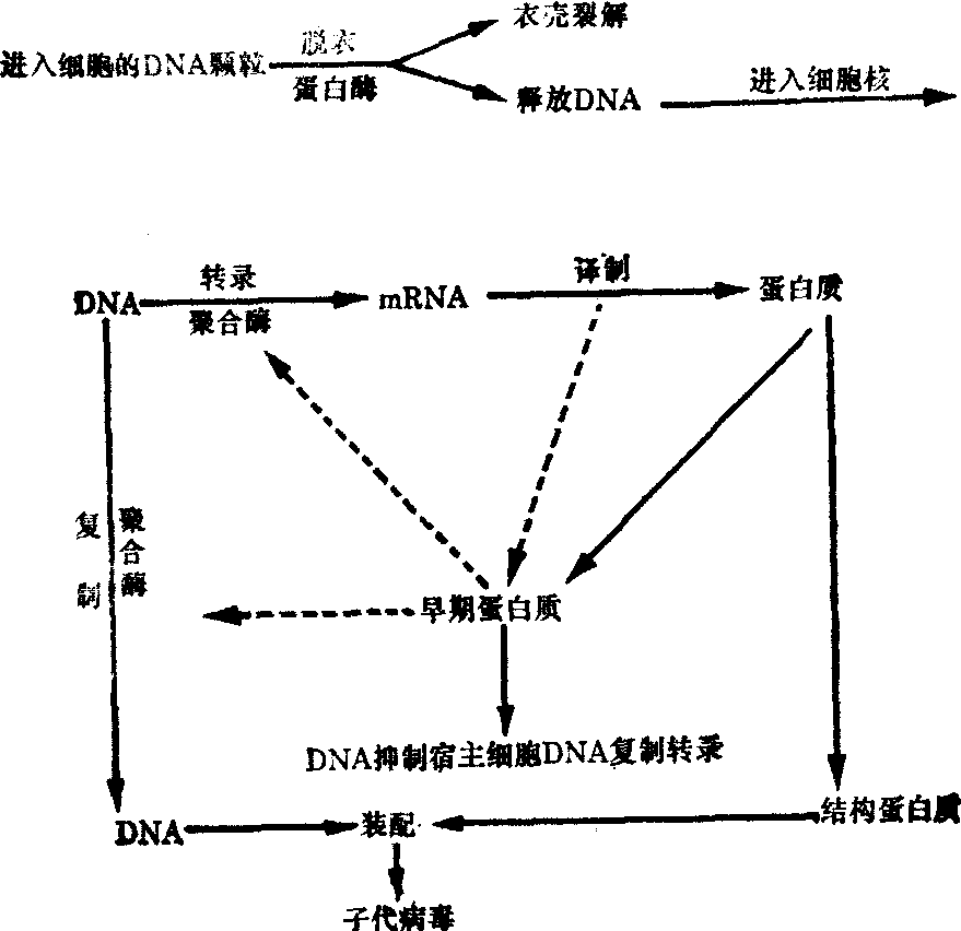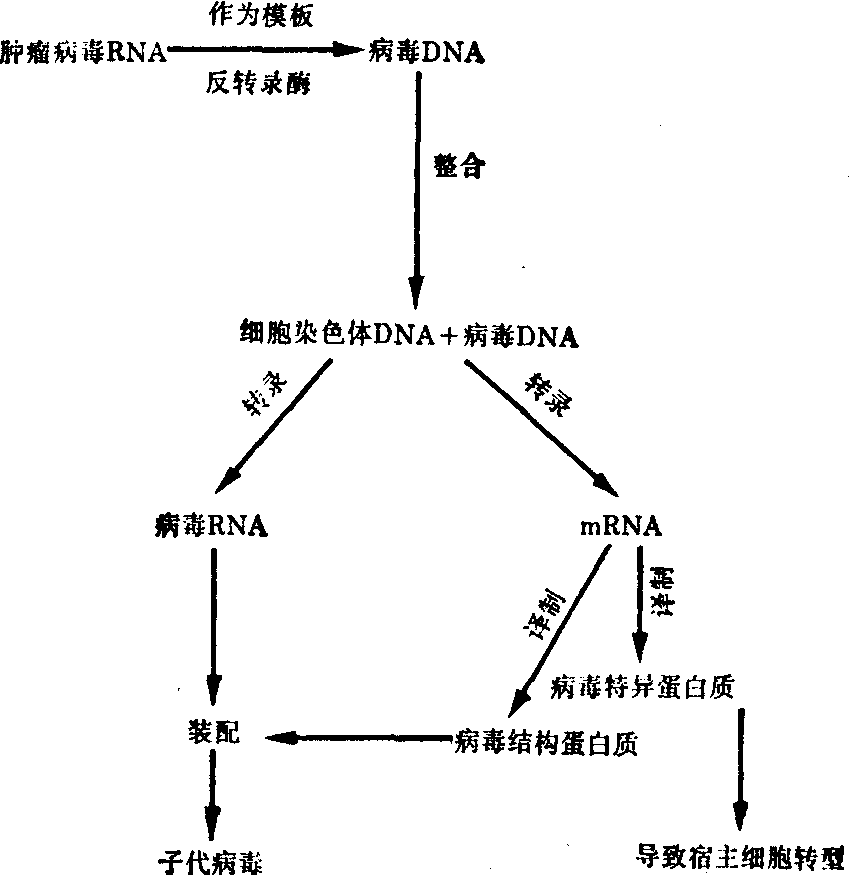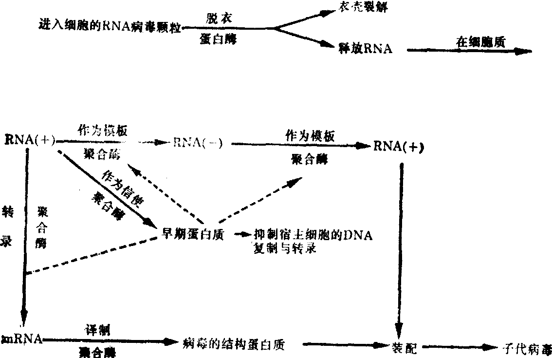 以上六组核酸类型的病毒,其复制的方法与过程显然是不相同的,表中仅选择最富代表性的双链DNA病毒、单链RNA病毒与单链RNA肿瘤病毒为例加以叙述。 当DNA病毒进入细胞蛋白衣壳裂解以后,被释放的DNA分子进入细胞核,在病毒DNA的指导下,利用宿主细胞的代谢系统首先翻译“早期蛋白质”,早期蛋白质的主要功能之一是关闭宿主细胞的基因调控、抑制宿主细胞本身的核酸复制与转录及蛋白质合成,另一种“早期蛋白质”可能是病毒特异性的聚合酶,在这些酶的催化作用下,以病毒DNA为模板,复制新的DNA,并转录带有病毒遗传信息的mRNA,mRNA与宿主细胞的核蛋白体相结合,按病毒的遗传信息,翻译病毒的结构蛋白质,这样就为子代病毒的装配准备了物质基础(图3)。 RNA病毒颗粒进入宿主细胞衣壳裂解以后,释放出病毒RNA。RNA分子本身首先可以作为mRNA,利用宿主细胞的代谢系统,翻译出“早期蛋白质”。这种早期蛋白质的功能与上述DNA病毒的“早期蛋白质”相同,一方面抑制宿主细胞DNA的复制与转录,同时在早期蛋白质提供的聚合酶的催化作用下,以病毒RNA分子自身作为模板,复制新的RNA分子,同时又转录mRNA,带有病毒遗传信息的mRNA与宿主细胞的核蛋白体相结合,翻译病毒的结构蛋白质,新复制的RNA与翻译的病毒蛋白质装配成子代病毒颗粒,以上的整个过程都在细胞质内进行(图4)。 凡是引起细胞转型的RNA肿瘤病毒,其复制过程与上述有根本的不同,当病毒进入细胞,衣壳裂解与释放RNA后,首先以病毒RNA分子为样板,在反转录酶(病毒自身所携带)的催化作用下,反转录出病毒的DNA分子,这种病毒DNA能与宿主细胞染色体的DNA链结合,称为整合,又以整合在细胞DNA上的病毒DNA为模板,转录新的病毒RNA与病毒mRNA,后者与核蛋白体结合,翻译出各种病毒蛋白质,其中包括病毒的结构蛋白质与导致宿主细胞转型的蛋白质,其结果,一方面是装配成新的子代病毒,另一方面导致细胞发生转型,转化为肿瘤细胞(图5)。