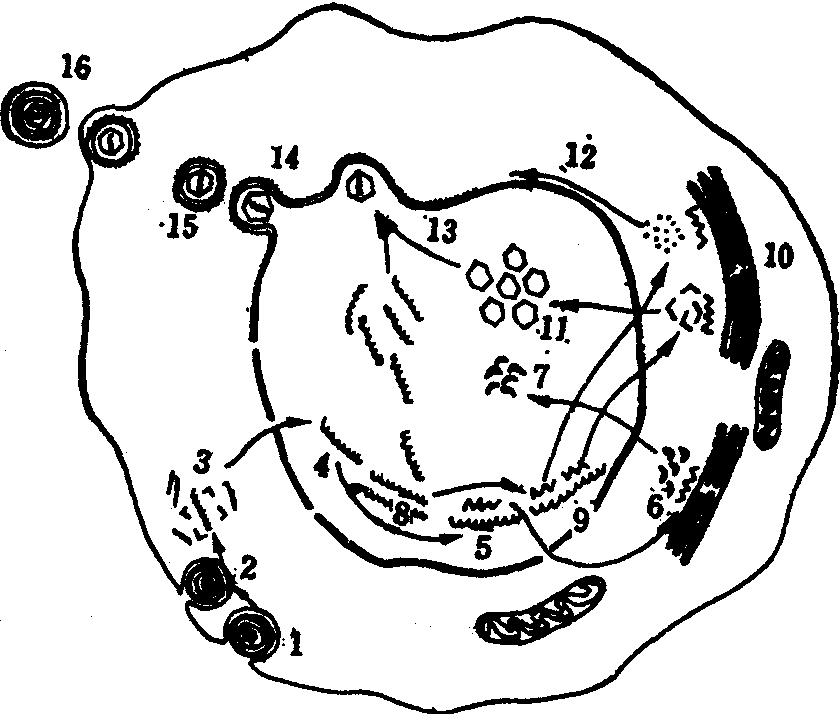 图6 病毒(疱疹病毒)在细胞内增殖(复制过程示意图1. 病毒吸附在细胞膜上;2. 以吞饮方式病毒进入细胞;3. 病毒衣壳裂解释放出核酸;4. 病毒核酸(DNA)进入细胞质;5. 以病毒DNA为模板转录早期mRNA;6. mRNA进入细胞质,在粗面内质网上与核糖体结合,翻译出早期蛋白质;7.早期蛋白质抑制细胞DNA的复制与蛋白质的合成;8. 以病毒DNA为模板复制出新的病毒核酸,新复制的DNA贮存在核内;9. 以病毒DNA为模板转录后期mRNA;10. mRNA在内质网上与核糖体结合翻译出病毒的结构蛋白质、衣壳蛋白质与囊膜小体蛋白质; 11.衣壳蛋白质进入细胞核内;12.囊膜小体蛋白质附着在核被膜上; 13.病毒DNA与衣壳装配成核衣壳;14. 核衣壳穿过核被膜时披上由双层核被膜特化的囊膜;15.在细胞质中的新病毒颗粒;16. 病毒从细胞释放出来。 病毒向细胞外释放 许多无囊膜的病毒,如腺病毒、小RNA病毒、小DNA病毒以及痘病毒等,从细胞向外释放的速度很快,当病毒释放时,引起细胞膜的崩解。有囊膜的病毒是以出芽方式释放,是细胞膜外卸的一种方式,病毒是先后逐步释放的。 从病毒侵入细胞到子代病毒的成熟释放称为一个增殖周期(或复制周期),对不同的病毒,其增殖周期所需时间不一,小RNA病毒仅需约2h多,疱疹病毒约10—15h,腺病毒14—25 h,每一个细胞内能复制装配多少病毒?不同的病毒不一样。根据电镜观察统计,小RNA病毒、小DNA病毒与腺病毒在每个宿主细胞内能复制装配数以万计的病毒,当然应指出,并不是每颗病毒都有感染性,而疱疹病毒与粘液病毒在每个宿主细胞内只能复制数千个病毒,痘病毒则更少。 病毒在细胞内的增殖过程是病毒与细胞相互作用的极为复杂的过程,也是宿主细胞结构功能进行重大改组的过程,绝大多数病毒在细胞内复制时,可以在显微镜下见到致宿主细胞病变(CPE),也有极少病毒(如猪瘟病毒),虽在组织细胞内复制装配并释放,但并未见到细胞明显的变化,甚至细胞可以带毒分裂繁殖。当病毒侵入细胞后,以一个核酸分子为模板复制大量的子代病毒时,首先要关闭细胞的基因调控系统,篡夺“细胞DNA的指导”作用,同时改装宿主细胞的结构与功能,为适应病毒的复制“服务”,因此被感染的细胞,必然要发生一系列重大结构的变化。绝大多数病毒能引起宿主细胞重要细胞器,诸如线粒体、内质网与核糖体、溶酶体、细胞核与核仁等的明显变化。线粒体的浓缩变性或膨胀,是病毒感染所引起的经常现象,这在一定程度上反映病毒复制与能量供应关系。内质网双膜变宽并形成空泡,诱导多聚核糖体的产生,这些显然与病毒蛋白质合成的功能有关,被病毒感染的细胞由于吞噬与胞饮作用加强,吞饮泡内的物质不能及时消化吸收,与溶酶体结合,形成大量的复合溶酶体。双层核被膜间距变宽,甚至核外膜突出呈泡,这有助于说明核质平衡的变化。染色质凝集于核被膜内侧,核仁解体等现象也是病毒感染细胞发生的普遍现象,这是由于细胞核酸复制与转录,以及蛋白质翻译过程受阻在形态上的表现。除了上述细胞结构的变化,在病毒感染的细胞内,经常产生一些新的结构,这些结构在正常的细胞没有或很少见到,其特别重要的是毒浆结构,它与病毒复制装配的关系极为密切,病毒首先是在毒浆周缘装配形成。此外,微管、微纤维、副晶格与层板膜结构的形成也是某些病毒感染细胞的特征。这些结构与病毒复制的关系尚不很清楚。 病毒在细胞内的增殖为研究最重要的生物大分子——核酸与蛋白质的合成,及其相互关系提供了非常好的模型。核酸和蛋白质各自在生命活动中的作用以及它们之间的关系仍然是现代生物学研究的主要课题之一。而病毒的复制过程研究可为这些根本问题的阐明提供极为理想的资料。研究病毒在宿主细胞内的具体复制装配过程也可为病毒性传染病的防治机制与一些肿瘤发生的机制提供直接的理论依据。 ☚ 真核细胞的蛋白质合成和分泌 细胞周期 ☛ |