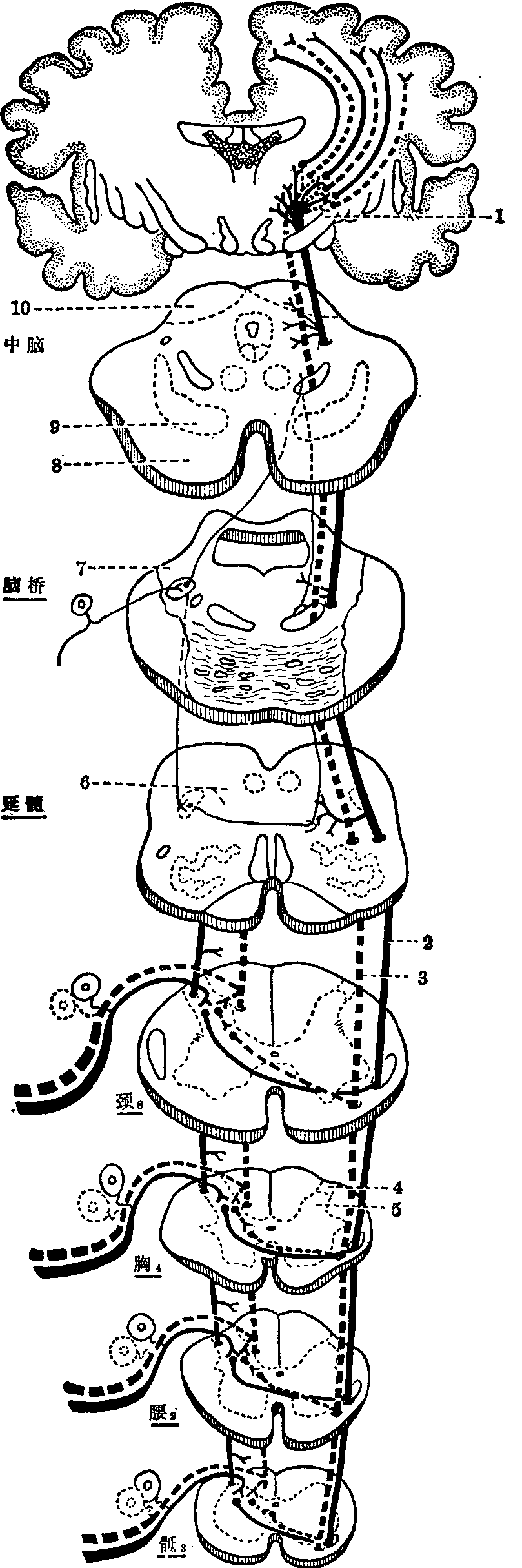 | 释义 | 痛、温觉传导路 痛、温觉传导路躯干四肢痛温觉传导路由三级神经元组成。一级神经元为脊神经节内的中、小型假单极神经元,其周围突的末梢起自皮肤等处的痛、温度觉感受器。中型假单极细胞的纤维是薄髓鞘的Aδ纤维,传导快痛。小型假单极细胞的纤维为无髓鞘的C纤维,传导慢痛。它们的中枢突经后根进入脊髓的背外侧束(Lis sauer束),分为短的升支和降支(上升或下降1~3脊髓节段),并沿途发出侧支。中枢突终止于后角的Ⅰ、Ⅱ层,与后角边缘核和胶状质的细胞形成突触。但胶状质细胞发出的纤维虽经背外侧束上、下行数节,最后仍终于胶状质,并不形成痛温传导路的第二级神经元。此通路的第二级神经元,即发出纤维组成脊髓丘脑束的神经元,在脊髓灰质中分布颇广,包括Ⅰ层和Ⅳ~Ⅷ层,但主要在后角。这些神经元的树突伸向胶状质,与第一级神经元短的升、降支和侧支形成突触。第二级神经元发出长轴突,经中央管前方的白质前连合交叉到对侧外侧索的前部,组成脊髓丘脑侧束上行。在脊髓,脊髓丘脑侧束在脊髓小脑前束的内侧上升,至延髓中上段,位于下橄榄核与三叉脊髓束和核之间,与脊髓丘脑前束合并,称为脊髓丘系。在脑桥和中脑,脊髓丘系位居内侧丘系的外侧,至背侧丘脑止于第三级神经元——腹后外侧核。自此核发出的纤维,经内囊后脚终于中央后回(3、1、2区)上2/3。在脊髓丘脑侧束中,来自脊髓不同节段的纤维具有局部定位,即来自骶段的纤维位于此束的后外侧浅层,来自腰、胸、颈段的纤维自外向内依次排列。在背侧丘脑腹后外侧核中亦有局部定位,即传导下肢冲动的纤维投射至核的外侧分,上肢的投射至核的内侧分。腹后外侧核发出的纤维,亦按这种躯体定位模式投至中央后回上2/3区域,上肢的代表区位