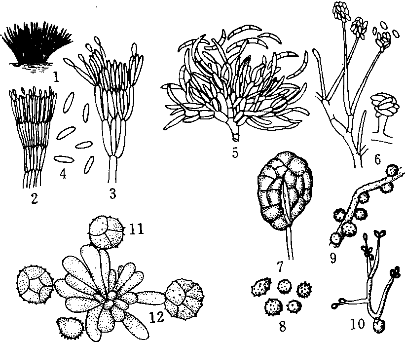 漆斑菌属(Myrothecium Tode ex Fr.) 分生孢子座浅杯状,浅色至暗色,边缘茸毛状,有或无刚毛;产孢细胞圆柱形、棍棒形或纺锤形,单瓶体式产孢;分生孢子梗无色至橄榄色,顶端分枝;分生孢子圆柱形或纺锤形,无色至浅色,单孢,聚集成黑色粘孢团。寄生或腐生,引起漆斑。常见的种有引起棉焦斑病并为害多种植物的露湿漆斑菌(M. roridom Tode ex Fr.)和引起水稻鞘枯病的疣孢漆斑菌[M. verrucaria (Alb.etSchw.) Ditm.]。 柱香菌属(Ephelis Fries) 分生孢子座杯形或突出,深色;分生孢子针形,单胞,无色。寄生于禾本科植物。有性态是瘤座菌属(Balansia)。常见种是引起稻一柱香病的稻柱香菌(E.oryzae H. Syd.),有性态是稻瘤座菌[B.oryzae-sativae(Syd.)Naras.]。 蜜孢霉属(Sphacelia Leveille) 分生孢子座表生,有柄;分生孢子梗紧密排列在子座表面,无色,无隔膜,上部分枝,产孢瓶体长瓶状;分生孢子卵圆形,无色,单胞,埋藏在蜜露中。有性态是麦角菌属(Claviceps)和香柱菌属(Epichloe)。常见种有引起多种禾本科植物麦角病的麦角蜜孢霉(S.segetumLev.),有性态是麦角菌[C.purpurea(Fr.)Tul.],还有引起高粱麦角病的蜀黍蜜孢霉(S.sorghi Ma-dras)。 镰孢属(Fusarium Link) 又称镰刀菌属。分生孢子梗无色,有或无隔膜,不分枝至多分枝,上端是产孢细胞,内壁芽生瓶体式产孢。分生孢子有二种类型:大型分生孢子椭圆形至镰刀型,无色,多胞,两端稍尖,略弯曲,基部常有一明显突起的脚胞;小型分生孢子卵圆形至椭圆形,无色,单胞至双胞,单生或串生。有的可在菌丝末端和中间或分生孢子上形成近球形的厚垣孢子。厚垣孢子无色或有色,表面光滑或有齿状突起,单生、串生或成团。在人工培养基上菌丝茂密,产生黄、红、紫等色素,并可形成圆形菌核,菌核颜色变化很大。有性态是赤霉属(Gibberella)、丛赤壳属(Nectria)、菌寄生属(Hypomyces)和丽赤壳属(Calonectria)等。属以下根据培养中是否形成大型或小型分生孢子和厚垣孢子及各种孢子的形态,分生孢子座和粘分生孢子团的性状以及培养基中产生色素种类分成不同组,组以下分种、变种或专化型。腐生、弱寄生或寄生,引起萎蔫、腐烂症状。已知约50多种,中国报道近50种。常见的种有: 串珠镰孢(F.moni-liforme),有性态是藤仓赤霉(G.fujikuroi),引起稻恶苗病;禾谷镰孢(F.graminearum),有性态是玉蜀黍赤霉(G.zeae),引起小麦赤霉病;尖孢镰孢萎蔫专化型 [F.oxysporum Schl. f. sp. vasinfectum (Atk.)Snyder et Hansen],引起棉枯萎病,还有引起亚麻枯萎病、蚕豆枯萎病和西瓜枯萎病等各个不同专化型。有关镰刀菌的专著较多,其中应用较广的是布思(Colin C.Booth) 1971年发表的“The genus Fusar-ium”。 绿核菌属(Ustilaginoidea Bref.) 分生孢子座生于禾本科植物的子房内,胀破颖片外露,内部色浅,表面密生孢子;分生孢子梗细,无色,产孢细胞短圆筒形,多芽生;分生孢子近球形,单生,单胞,淡褐至深榄绿色,表面有微刺,萌芽可产生卵圆形次生小孢子。寄生,引致曲病。已知5种,中国报道4种。常见种是引起稻曲病的稻绿核菌[U.oryzae (Patou.) Bref.]。 座枝孢属(Ramulispora Miura) 分生孢子座生在寄主植物气孔下,上面紧密排列分生孢子梗;分生孢子梗短小,无色;分生孢子线形,无色,多个隔膜,有时侧生短分枝,直或微弯。在基物表面常产生圆形菌核。寄生植物叶片,引起斑点症状。中国报道2种。常见的种有引起高粱煤纹病和紫斑病的高粱座枝孢[Rsorghi (Ell. et Ev.) Olive et Lefeb.]和高粱生座枝孢(R sorghicola Harris)。 附球菌属(Epicoccum Link) 分生孢子座垫状,黑色;分生孢子梗短,紧密排列在子座表面,直或弯曲,无色至淡褐色,表面光滑或有微刺;产孢细胞圆柱形,单芽生式产孢;分生孢子单生,近球形或梨形,单胞或多胞,深金黄褐色,常有一淡色柄细胞。腐生或弱寄生,引起斑点症状。已知2种,中国报道1种。常见的种是引起小麦黑点病和玉米、高粱红斑病的黑色附球菌 (E. nigrum Link)。小麦附球菌 (E. triticiHenn)、隐附球菌(E.neglectum Desm.)和稻附球菌(E.oryzae Ito et Iwadare)可能与黑附球菌是同一种。 瘤座孢目Tuberculariales半知菌亚门,丝孢纲。菌丝有隔膜,淡色至暗色。菌丝体繁茂,产生分生孢子座。分生孢子座垫状、碟状或瘤状等,蜡质或胶质,暗色或鲜色,平滑或有毛。分生孢子梗着生于分生孢子座上,单枝或分枝,有隔膜,无色至暗色,聚集或分散,端部产孢细胞内壁芽生,瓶体式产孢或全壁芽生产孢。分生孢子球形、镰刀形、圆筒形等,单胞、双胞至多胞或砖格孢,无色至暗色。有性态为子囊菌。陆生、腐生或寄生,营寄生的种类引致植物立枯、赤霉、叶斑和干腐等症状。本目仅有瘤座孢科一科,含蜜孢霉属、镰孢属和绿核菌属等100余属。 |