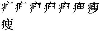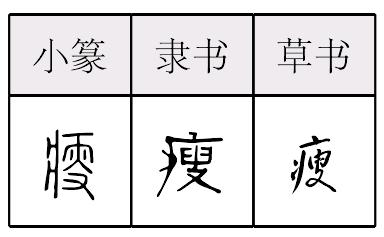 【提示】 , 7画, 中间的一竖上下端均出头。 *瘦shòu14画 疒部 (1) 脂肪少,肌肉不丰满: ~骨嶙峋|~弱|枯~|面黄肌~。 (2) 衣服鞋袜等窄小: 这裤子太~,我穿不了。 (3) 土地不肥沃: ~田。 瘦shòu小篆以来的形声字。从病头,叟(sǒu)声。叟上本从宀(mián,房屋),下,从火从又(手)。是用手执火在屋中搜查义。是搜的本字。假借指老头。叟与瘦声母演变从舌尖前到翘舌音,如寺诗侍、似始、生星、色又读shǎi例。指肌肉不丰满。跟“肥”相反。如:身体很瘦。又指衣服鞋袜等窄下。如:这件衣裳穿着瘦了。引申指土地瘠薄。如:田瘦合归耕。又指笔画细。如:瘦硬|胡肥钟瘦(胡、钟分别指胡昭、钟繇的书体)。 瘦★常◎常