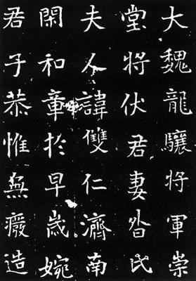 【简介】: 全称《大魏龙骧将军崇训太僕少卿中给事中明堂将伏君妻昝氏墓誌铭》。北魏孝昌二年(526)五月刻。正书。十七行,行十七字。49.3×48.5cm。一九二六年洛阳出土。曾归三原于右任。现藏陕西西安碑林。赵万里辑入《汉魏南北朝墓誌集释》。 【赏析】:  墓用笔或方或圆,点画圆润,虽不如造像记那样雄强峻宕,但丰腴遒润,随手变化,姿致灵活。刻工当爲一时高手,故能忠实原书,使得该誌刀、石、笔的综合效果颇爲默契生动。如第二行“氏”,点画圆润坚挺,每一笔的藏锋逆入,行笔过程中的提、按、缓、急十分淸楚。第十一行“其”字,不仅全貌丰厚端凝,且于笔势间自然流贯的承接关係也表现得十分生动妥贴,尤其最末两“点”,顾盼之情,更爲别致。 此誌结字以平正匀整爲主调,风致浑朴雅驯,但又新构时出,神态生动。第一行“卿”字,左中右三部分依次向右迭下,虽是造险,却能使读者产生稳妥之感。 下面“给”字的“合”,一撇一捺的伸缩对比格外强烈。短撇让左,使中宫紧敛;长捺尽意向外拓展,造成字势的排宕;且左低右高,出人意料。第九行“应”字,变半包围结构爲上下结构,两部分错落有致。第十五行“永”字,右边的啄、捺合写成竪弯鈎,且突发奇想,写得顶天立地,造成字内左密右疏的强烈对比。一这些,都是别生意趣的新理异构,都反映了作者随机应变的造型才能。 |