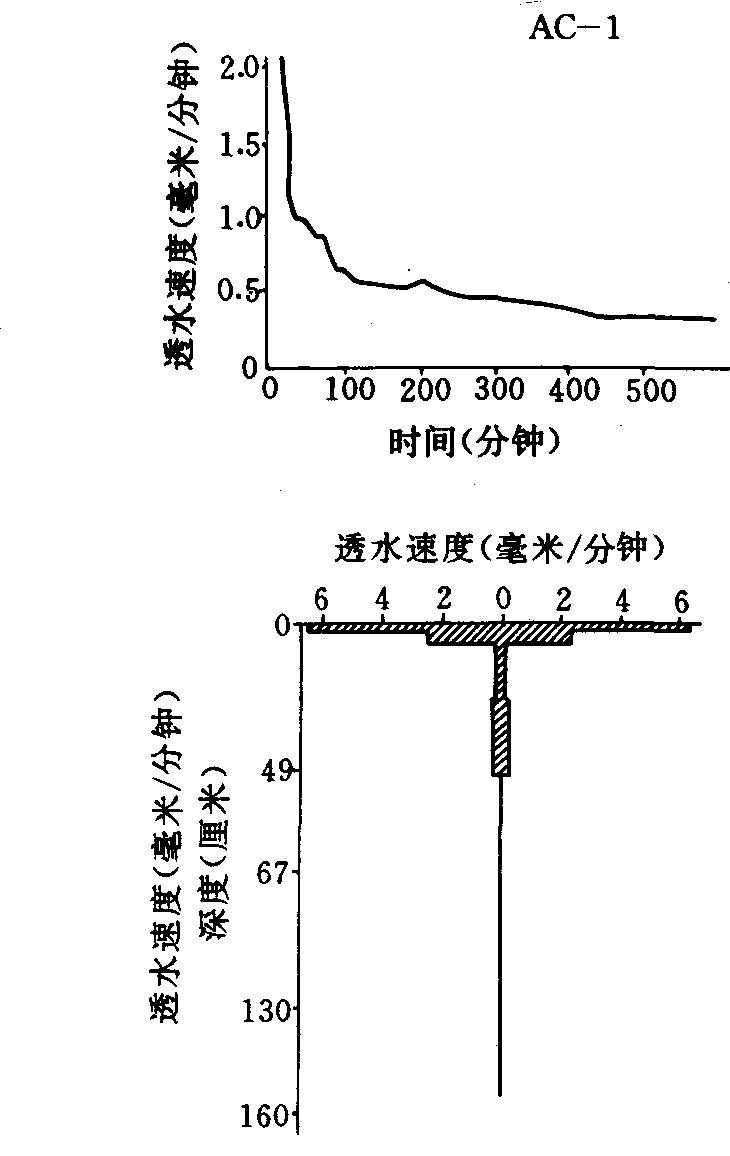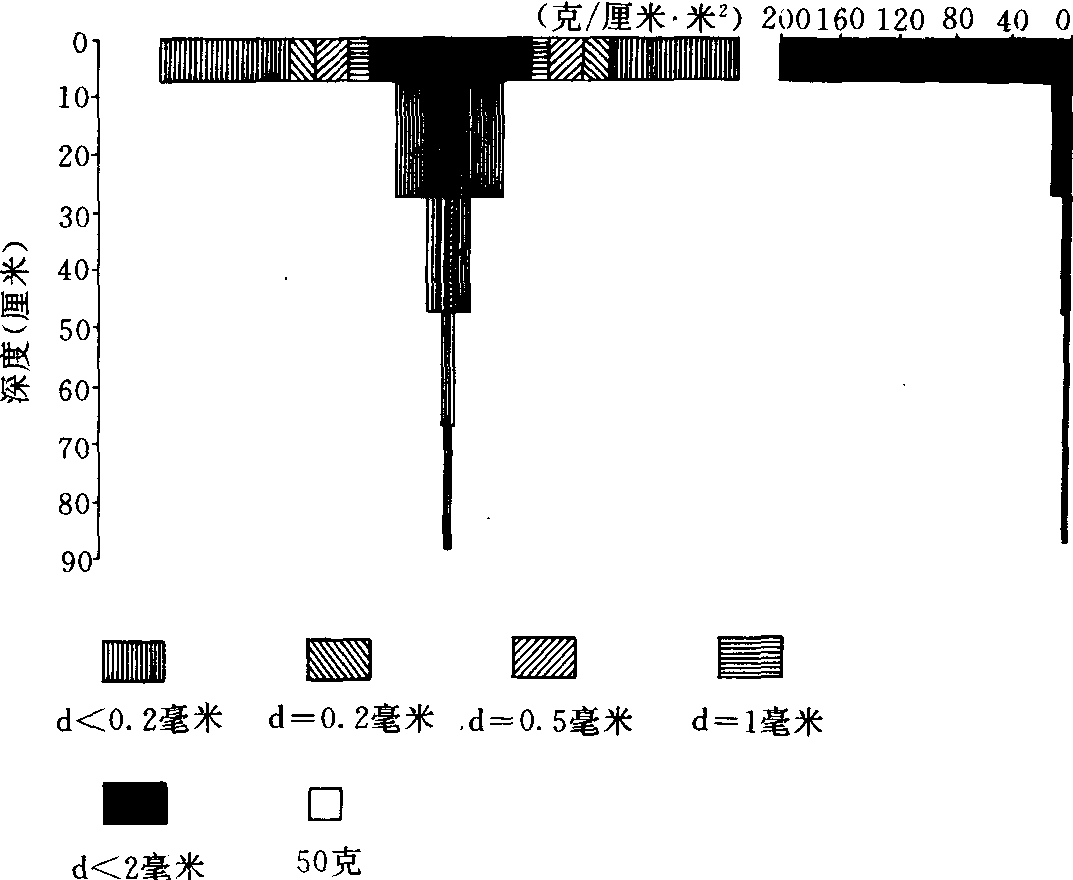 基本性质 ❶形态特征 白浆土剖面有腐殖质层、白浆层、淀积层和母质层四个明显的发生层次,腐殖质层厚约10~20厘米,粒状、团块状结构,草本植物根系大部集中在此层。向下为白浆层,厚20厘米左右,灰白色或草黄色,无结构或片状结构,多小孔隙,根系少,有较多的铁锰结核或铁锈斑。淀积层厚40厘米以上,棕褐色到暗褐色,粘紧,根系极少,核块或棱柱状结构,俗称蒜瓣土,含少量铁锰结核,结构面上有暗褐色胶膜和白色硅酸粉末,再下为黄棕到棕色母质层。 ❷表层多为中壤土到重壤土,淀积层大部为轻粘土。机械组成以粗粉粒(0.05~0.01 mm)最多,其次是粘粒。腐殖质层富孔隙,容重1克/厘米3;向下各层1.3~1.5克/厘米3,孔隙小,透水性不良(图2),以上的物理性质决定,降雨后水分滞留在上层,土体蓄水量少,故不抗旱