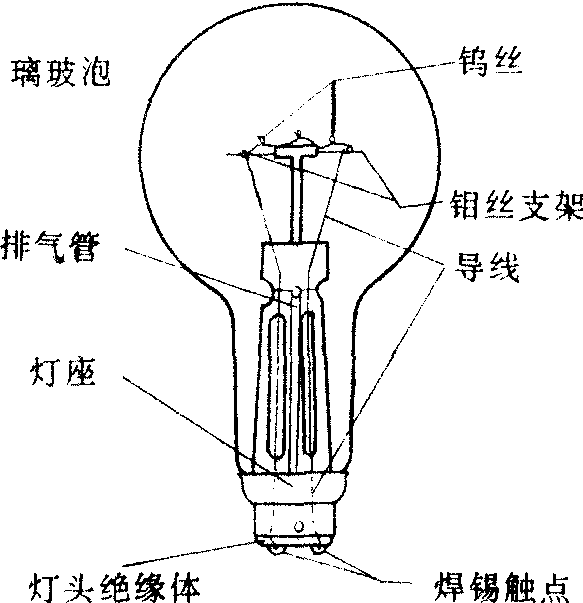 各种灯 各种灯利用电能发光的灯:电灯 电炬 电灯的旧称:电气灯 白炽灯:钨丝灯 小的电灯泡:电珠 闺中的灯:香灯 红色的灯:红灯 朱灯 莲花灯:莲炬 用雪制作的灯:雪灯 一种用以表明船舶停泊的信号灯:锚灯 在死者脚旁点的灯:随身灯 未点燃的灯:焌灯 悬挂的灯:吊灯 挂灯 灯挂 佛前垂挂的灯:轮灯 悬挂或手提的笼形灯:灯笼 笼灯 装在道路上的灯:路灯 街灯 衢灯 有台座的灯:台灯 桌灯 小灯:短檠 精致的灯具:兰灯 精美的灯:玉釭 雕饰华美的灯:华灯 华镫 ☚ 灯 油灯 ☛ 白炽灯将灯丝通电加热到白炽状态,利用热辐射发出可见光的电光源。1879年美国的爱迪生制成碳丝白炽灯。1907年,A.贾斯脱制成钨丝白炽灯。(钨的熔点3680K±20 K,发光效率可达52 lm/W。钨丝实际工作温度为2800~3000 K。)随后不久,美国的I.朗缪尔发明螺旋钨丝,并在玻壳内充入惰性气体氮。1912年日本的三浦顺一将钨丝从单螺旋发展成双螺旋。1935年法国的A.克洛德在灯泡内充入氪气、氙气。1959年美国制出卤钨灯。白炽灯的发展趋势是研制节能型灯泡。 白炽灯 白炽灯baizhideng利用固体被加热到白炽温度(1500℃)而发光的光源。太阳是最重要的白炽光源。1879年,爱迪生发明了白炽电灯,最初是碳丝白炽电灯,后来改进为充气钨丝灯及卤钨灯。白炽电灯通过给灯丝通电,使其达到白炽温度而发光,属热辐射电光源。可用直流电或交流电,有适用各种电压的白炽灯。其基本构造如图示。为了使光色好、发光效率高,灯丝温度要高,碳是熔点最高的物质,因此最早制成的是碳丝灯。为了解决碳蒸发率高的缺点,1906年,改用熔点和蒸发率都低于碳的钨作为灯丝。钨在高温时有较高的机械强度,容易加工成形,因此一直沿用至今。可在灯泡内充入氩、氮等气体用以抑制钨的蒸发;采用双螺旋形灯丝,减小灯丝和气体接触的面积,以减少充气的热导损失。它使用方便,发光颜色好。60瓦的白炽灯的光效约为10~20流明/瓦,寿命约1000小时。