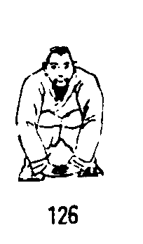 四十九式经络动功第3段“导气”动作之六(全套动作顺序第二十八式):两掌触地不动,两腿屈膝全蹲,臀部触地,全身缩成一团,两膝内侧相靠;抬头眼看前方。(图126)要点:脚跟不能提起;两掌不能离开地面;成缩身全蹲时尽量呼气;意守涌泉。