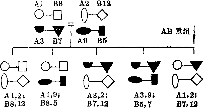 HLA的遗传符合孟德尔遗传定律。同一条染色体上的A、B、C、D、DR等基因组成单倍型(haplotype),这些单倍型从亲代传递给子代,如图2所示,因此每个个体的两条单倍型分别来自父母。在形成生殖细胞的减数分裂过程中,同源染色体之间可能发生交换而组成新的单