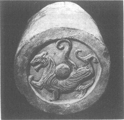 西汉。面径18.5厘米。1958年陕西省汉长安故城遗址出土,陕西省博物馆藏。虎为浮雕式,右前腿向上弯举,左后腿高高扬起,长尾腾空蛇曲,瞋目,张着血盆大口作怒吼状,凶猛无比。通体的条形纹,更增加了其质量感,令人望而生畏。白虎,四神之一,代表西方。有研究者认为,白虎瓦当是汉未央宫西方殿阙上的瓦当。瓦当见“‘羽阳千岁’瓦当”条目。