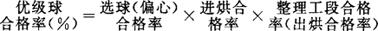 指一种衡量乒乓球质量的指标,选球合格率、进烘合格率、整理工段合格率三者的乘积。其计算公式为: