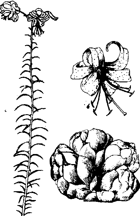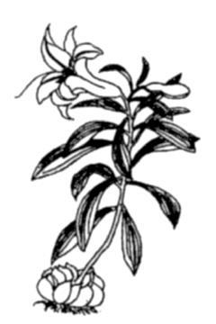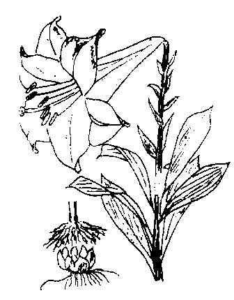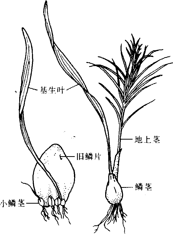 图 2 百合鳞片形成小鳞茎示意图 贮藏加工 百合一般在11月初采收。掘出鳞茎及时除茎秆、泥土、剪须根,置室内分级贮藏。层积贮藏法于地面铺5~8厘米厚湿土,鳞茎排列土上,其上覆土3~4厘米,土上再排放鳞茎,如此堆叠,高达1米,于四周及顶部盖土20~30厘米。贮藏期须保持低温和定期检查,一般可贮藏至翌年3月,若在0℃冷库可存放更长时间。硅窗塑料帐气调贮藏效果更好。干百合可久存远运。百合干制品的加工方法是:剥离鳞片,洗净后入沸水“烫漂”5分钟,转冷水中冷却,置竹帘曝晒或在60℃烘干室经15~16小时干燥,干燥后在室内堆放2~3日回软后包装。100公斤鲜百合可制30~40公斤百合干。 病虫害及防治 百合主要病害是软腐病(见大白菜);主要虫害有蛴螬(Holotrichia diomphalia),为东北大黑鳃金龟的幼虫。 百合药名。出 《神农本草经》。又名药百合。为百合科植物百合Lilium brownii F. E. Brownvar. viridulum Baker 或卷丹 L.lancifoliumThunb. 细叶百合L. pumilumDC. 等的鳞茎。主产湖南、浙江、江苏、安徽。甘、微苦,微寒。入肺、心经。润肺止咳,宁心安神。 百合lilyLilium sp.,百合科,百合属。古称番韭。多年生宿根草本。2n=2x=24。原产亚洲东部,中国普遍栽培。百合属约有80种,中国有39种,供食用者仅有10个种和两个杂种。广为栽培的有龙牙百合、川百合和卷丹百合3个种。茎高60~100 cm。叶无柄、互生、披针形、绿色。有的种叶腋着生紫褐色的珠芽,有的种地下茎节着生白色的小鳞茎。鳞茎由许多披针形肉质鳞片抱合而成。花单生或排列呈总状花序。蒴果,内含种子约240粒。种子扁平、有翅,千粒重3.4 g。喜温暖干燥,茎叶不耐霜冻,鳞茎耐低温。宜在土层深厚、排水良好的砂壤土栽培。忌连作。用珠芽、小鳞茎、分株的鳞瓣繁殖。寒地9月上旬,暖地10月下旬栽植,也可春植。每株留一个健壮的地上茎。11月初采收。鳞茎供食用或药用,也可制淀粉。花供观赏。 百合别名野百合。多年生草本,高约80厘米。地下鳞茎圆锥形,淡黄色。茎单一,直立,光滑无毛。叶互生,披针形,全缘。花顶生或腋生,淡紫红色。蒴果倒卵形。阿尔泰山山区有分布。具有润肺止咳、清热安神的功能。药用鳞茎。主治肺痨咳血、体虚咳嗽、心悸失眠等病症。 百合百合科百合属多年生球根花卉。全属约80余种,中国产41种。百合为地下鳞茎,地上茎高0.5~2.0 m。叶披针形或线形。花单生或总状花序。花被6裂。蒴果3室。染色体数为x=12。中国主要栽培种类有:百合(茎高0.7~1.5 m,花1~4朵)、兰州百合(茎高1~2 m,花10~40朵)、卷丹(茎高0.8~1.5 m)、天香百合(茎高0.4~1 m)、白花百合(茎高1.0~1.8 m,花2~9朵)、山丹(茎高0.3~0.6 m)等品种。 百合 百合产于平陆。补血益气,蜜、白糖拌服,能起安眠的作用。 ☚ 绛州莲 太谷西瓜 ☛ 百合 百合baiheLilium buonmu单子叶植物,百合科。多年生草本。地下鳞茎近球形,鳞茎瓣宽展,无节,白色。茎直立,有紫色条纹,叶散生,上部叶比中部叶小,成苞片状,倒披针形,全缘,具短柄。花1~4朵生于茎端,喇叭形,有香味。花被片6枚,多为白色,背面带紫褐色,无斑点,顶端弯而不卷。雄蕊6枚,着生于花被的基部。子房上位,柱头3裂。蒴果直立,矩圆形,有棱,内有多数种子。生于山坡林下或溪沟边,也有栽培。分布于东南、西南、河北、河南、陕西及甘肃。用鳞茎繁殖,花供观赏;鳞茎可食用或药用,能润肺止咳、清心安神。 ☚ 小嵩草 郁金香 ☛ 百合 百合Baihe百合科。多年生草本,具鳞茎;鳞茎球形,直径约5厘米,鳞叶肉质,白色,无膜质鳞片。叶散生,倒披针形,具3—5条脉。花1—4朵,喇叭形,有香气;花被片6,倒卵形,白色,背面带紫褐色,无斑点;雄蕊6,花药丁字形着生;花柱1条,柱头3裂。蒴果长圆形,具多种子。分布于我国东南、西南、河南、陕西、甘肃。生山坡石缝中。鲜花含芳香油,可作食品、香料;鳞茎可食或入药,亦可栽培供观赏。