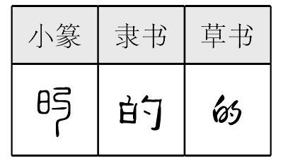 形声,小篆从日,勺声,隶定为“的”。本义读dì,明亮、鲜明,假借为箭靶的中心、目标等;又读dí,引申为副词,相当于“的确”“确实”;又读de,假借为助词,表示定语和中心词之间是修饰关系或领属关系等。 【辨析】 的/地/得 这三个字都读de,用于结构助词,但用法不同:“的”用在定语之后,如“老师的评语”“蔚蓝的天空”;“地”用在状语之后,如“刻苦地学习”“兢兢业业地工作”;“得”用在补语之前,如“跑得快”“听得清楚”。的 篆 隶dì【析形】形声字。小篆从日,勺声。隶变后日讹变作白,从白,勺声。 【释义】《说文》:“明也。”本义是明亮、鲜明。李煜《送邓王二十六弟牧宣城序》:“秋山的翠,秋江澄空。”颜色白而发亮,给人以鲜明显著的感觉, 成为射箭的显著目标,是箭靶的中心,所以箭靶的中心也称“的”。[众矢之的]许多箭射击的靶子,比喻众人攻击的目标。[一语中的]一句话就击中要害,“的”由箭靶的中心喻指要害之处。做事要达到预期的结果,就像箭要射到靶子上一样,故称[目的]。箭不虚发则射到“的”上,故有确实、实在的意思,如[的确]、[的论]。 【shape analysis】It is the pictophonetic character.In Small Seal script the meaningful part is日(rì,the day or the sun)and the phonetic component is勺(sháo).After the Scribe changes it has changed to白(bái,white)and勺(sháo). 【original meaning】Bright and clear. 的1〈动〉(1)去。用在另一动词性词语之后,表示动作的趋向。 《金》十三: [西门庆]趔趄着脚儿,只往前边花园里走~。 《聊·姑》三: [大成]便把自家这银子包上,说:“没要紧,你拿了去回地~罢。”又 《慈》十一: 那仇家自从那失火之后,处处俱是灰尘,进~看看,一片荒凉。又 《禳》二九: 今日你就住下,我打发人去支你的身价,给你取箱子~。 (2) 到。(a) 用在另一动词后,表示动作的结果。 《金》四三: 李大姐,你接过孩子来,教迎春抱~屋里去罢。 《聊·翻》十: 忽然走进你那角门,这心里就像听~你那声音,定醒了一霎,才知道没人。(b) 用在另一动词后,表示动作所达到的处所或时间。 《金》九: 西门庆不当死,不知走~那里去了,却拿这个人来顶缸。又四二: 等着夏提刑娘子到才摆茶,不料等~日中还不见来。(万本。戴本改为“到”) 《醒》四一: 做了顶三幅布的孝帐挂~材头。又六十: 他就不知道与婆婆奔丧么?见婆婆倒下头,倒跑~家去了! <异>得。 《金》八一: 这厮不知在那里 酒, 得这咱才来。 《醒》十: 那过付的人自有妙法,人不知鬼不觉交得里面。 <方>今北京、山东话有此义。