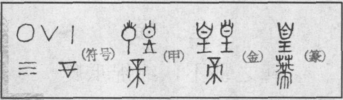 读者朋友别以为我是在画英文字母。这些形似字母的符号,都是八卦符号,上排是阴阳符号,下排是代表“风”的符号。它们是汉字组字的重要零件,如果没有这些零件的参与,有些汉字不仅笔画繁多,而且也不一定能够标明字意。由于它们参与了“皇帝”二字的组构,因此,得先标示出来以便从头说起。 甲骨文的“皇”纯粹由阳性符号构成,取象于花蕊,是花蕊的完整形象。花蕊,俗称花心,植物生殖器官的一部分。“皇”的上部“ ”形为柱头,也称雄蕊,下部的“♀”为子房,也称雌蕊。从二款开始造字者就给“皇”赋予了神秘色彩,上部不仅是一发光的太阳之形状,而且是由两个重叠的阳性符号构成,其寓意也是太阳。下部的“王”不仅增加为声符,而且也是意符,甲骨文的“王”字,其原形文字界一致释为是一把斧头,“斧”在那时是王权的象征,对于这一释解似乎没有异议。其实不然,它原是远古时代中华民族的共同祖先华胥氏及其后裔伏羲、女娲族的风姓符号,来源于对八卦巽卦符号的变体写法。巽为“风”,风在这里既是对祖先的继承,同时也能体现“王”的真实内涵。于是,这“皇”字从此也就沾上了“王”气。金文的 “皇”,上部像皇冠,据史书记载,远古时代有虞氏首领祭祀时头戴“皇”,(《礼记·王制》:“有虞氏皇而祭”) 下部变作 “土”,土乃 “王”的省形,况“土”也是男性性器的表意符号。到了秦朝,宰相李斯作小篆时,在金文基础上为了迎合始皇大帝的心理,以“自”、“王”造“皇”字。又因“辠”(古罪字) 与“皇”相近似,秦皇感觉很不顺眼,遂令李斯废“辠”立“罪”。李斯不愧为文字大家,“罪”,上网下非,取形造意都不错: 非法之徒就难逃法网,与“自辛”的“辠”(辛,据认为是古代为一种刑具) 造意相似。可见秦始皇对“皇”是注有深情的。楷书写作“皇”,从白、王声,为形声兼会意字,“白” 甲骨文通“伯”为长男的字符。 皇的本意是花,《诗经·小雅·皇皇者华》:“皇皇者华,于彼原隰”,是说绚丽多姿的鲜花,在平坦的湿地开放。由本意引申有美意,汉代扬雄 《法言·孝至》: “尧舜之道皇矣”。还有盛大貌,《诗经·大雅·假乐》: “穆穆皇皇,宜君宜王”。也指辉煌,《诗经·小雅·采芑》: “朱芾斯皇,有瑲葱珩”,译作: 红色护膝多辉煌,玉佩摇摆铿锵响。《说文》: “皇,大也。从自,自,始也,始皇者,三皇大君也。自读若鼻,今俗以始生子为鼻子”。许慎对甲骨文、金文的字形演变不甚了了,是按小篆形体作出解释的,自然不失杜撰之嫌。“皇,大也”的解释是对的,因此,从“皇”所组构的汉字如湟、煌、惶、徨、隍、蝗、鳇、篁、凰等都具有盛、大及盛大之意。 甲骨文的帝,是蒂之本字。有象形与会意两种解释,以象形解释花蒂之“蒂”,以会意析形帝王之“帝”。本节是按象形来解释花蒂之“蒂”的。 “帝”,像花蒂之形,花或果与枝茎连接的部位,具有关键的生殖意义,故曰蒂。 金文的 “蒂”,其上部简作 “▽” 形,不仅是华蒂之形状,同时也是女性性三角 (或称生殖三角)的标意符号。小篆的“蒂”,增加草字头从带,可能是造字者为避帝王之“帝”的讳而刻意做之。 蒂的取形造意可以追溯到只知其母不知其父的母系族落时代,造字者把这种对女性生殖崇拜情结,集中转移为花蒂的“蒂”字情结,反映的是生殖崇拜文化现象的一个崭新阶段。以物托情,是思维观念的刷新,也是从个别到一般、从具体到抽象认识史上的一次飞跃。郭沫若以大家的睿智和诗人的想象与激情,对“帝”做了如下阐述:“知帝为蒂的初字,则帝之用为天帝义者,亦生殖崇拜之一例也(卜辞“帝”多用为至上神之称号),帝之兴,必在渔猎牧畜已进步于农业种植以后,盖其所崇祀之生殖,已由人身或动物性之物,转化而为植物,古人固不知有所谓雄雌蕊,然观花落蒂存,蒂熟而为果,果多硕大无朋,人畜多赖之以为生,果复含子,子之一粒, 复可化而为亿万无穷之子孙, 所谓之鄂不 (胚),所谓绵绵瓜瓞,天之神奇,更无有过于此者也,此必至神者之所寄,故宇宙之真宰,即以帝为尊号也。” (《甲骨文字研究》) 郭老的这一段论述没有一个句号,是一口气写下来的,洋洋洒洒,入木三分。只可惜他没有与 “皇”字联系在一起,这不能不是一个遗憾。 皇帝者,蒂之情结的集中表现。称“帝”者无疑体现的是华夏民族的自信与骄傲。