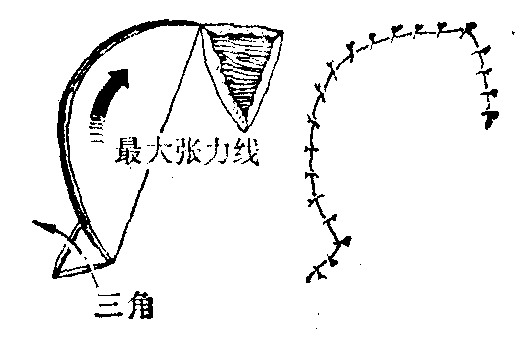 图3 轴型皮瓣 旋转皮瓣 是在创缘外围的局部形成,按顺时针或逆时针方向旋转一定角度后,移转至修复部位的皮瓣,皮瓣移转时,如旋转角度较大,则在皮瓣蒂部相当旋转轴心的部位常出现名为“狗耳”或“猪耳”的皮肤皱褶,并常发觉在旋转轴线上张力最大,称为最大张力线。旋转角度愈大,“狗耳”及张力亦愈显著。“狗耳”需在另一次手术切除修整。减缓张力可有几种方法:或采用“逆切”(backcut); 或在最大张力线上作与此线垂直交叉的仅深及真皮的短小而不予缝合的切口;或延长皮瓣外侧缘的长度。但这些方法,对皮瓣的血运都不无影响,故须慎重使用。在蒂的基部外方所出现的皮肤皱褶,可切除一小块三角形称为Burow三角的皮肤,即可平整缝合(图4)。