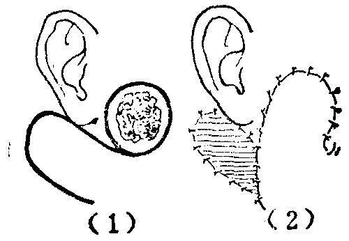 图18 双蒂皮瓣修复胫前缺损 皮下组织蒂皮瓣 为由肌皮动脉供血部位所形成的蒂部不包含皮肤而仅由皮下组织构成的皮瓣。与岛状皮瓣的原则有某些相似之处,但活力则相差较多,故此类皮瓣的蒂部应较宽且不可太长,以免皮瓣血运不足。皮下组织蒂皮瓣常在皮下血管丰富密如蛛网的面、颈部应用,属于局部或邻位皮瓣。经在皮下潜行剥离的间隙行推进或旋转移转,因蒂部没有较韧的皮肤制约,移转时较松动灵活,不出现推进皮瓣或旋转皮瓣的皮肤皱褶(图19)。