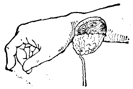 图6 易位皮瓣 翻转皮瓣 属于局部皮瓣。当远位皮瓣或皮管需借腕部的携带进行间接移转时,可在腕部的桡侧形成一个皮瓣,并翻转180°,使与腕部所共同组成的创面,恰与皮瓣或皮管断端需行蒂连的创面的形状大小相同而能相互吻合。腕部的皮瓣即为翻转皮瓣(图7)。当移转过程结束后,此皮瓣仍可翻还原位。由于此种皮瓣的翻转有如合页或活板门或书本的开合,故又有合页皮瓣、活板门皮瓣、“掀书”皮瓣(book flap)等名称,修复洞穿性缺损所需的衬里也常利用翻转皮瓣形成,所以还有衬里皮瓣之称。