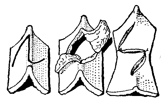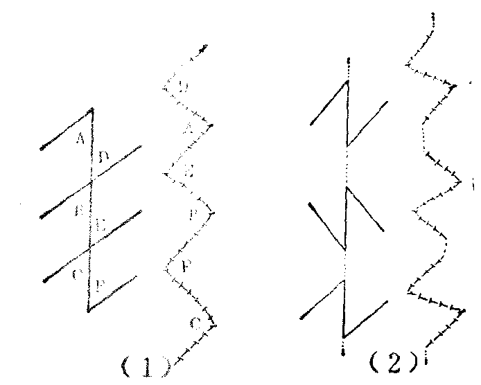 图12 连串Z成形术(1)相连接的连串Z成形术; (2)间隔的连串Z成形术。 Z成形术是整形外科所广泛应用的基本手术方法之一,最常用于松解条索状的直线瘢痕挛缩。其法,以瘢痕为中轴线,利用在其两侧正常皮肤所形成的三角形皮瓣易位缝合,挛缩即可获松解,且因缝合后呈Z形,还可以避免挛缩复发,Z成形术还常用于矫正蹼状挛缩 (图13),以蹼的游离缘为中轴线,将蹼劈分为均等的两面,在两面形成一对或几对方向相反的三角形皮瓣,互易位置后相嵌缝合成Z形或锯齿形,蹼即消失,挛缩亦随之松解。臂与轴间的夹角以70°为宜。蹼较薄弱或为有瘢痕的组织,经劈分切开形成皮瓣后可能因血运不足出现坏死,宜慎用。矫正蹼状挛缩,还有四瓣Z成形术(图14),不仅各瓣的移转较为灵活,顺中轴线的延长长度也较大。Z成形术还常用于松解环形狭窄,其原理与矫正蹼状挛缩相同(见“先天性手缩窄环”、“先天性足畸形”)。此外,还常用于错位组织的复位(图15)。以及改正某些部位创口的直线缝合,俾预防因直线瘢痕发生挛缩出现畸形,如唇裂的修复手术设计即须本此原则。