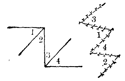 图15 Z成形术原则用于口角错位的复位 W成形术 为除Z成形术外的另一种改变直线方向缝合的手术方法,可认为属于局部推进移转的一串皮瓣。其法,为于切口两侧创缘切成互相交错的锯齿状,于剥离后,使两侧的小三角形皮瓣相向推进拼插镶嵌缝合,如W>字形,故名(图16)。因两侧的皮瓣并不易位移转,故无延长效果。W成形术,可用于缝合针迹显著且瘢痕较宽时的修整。