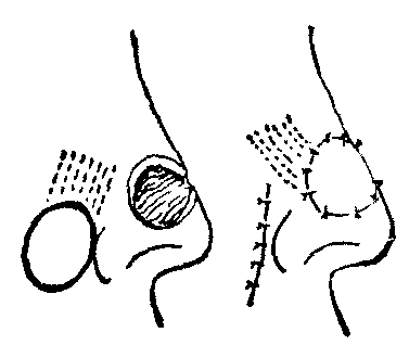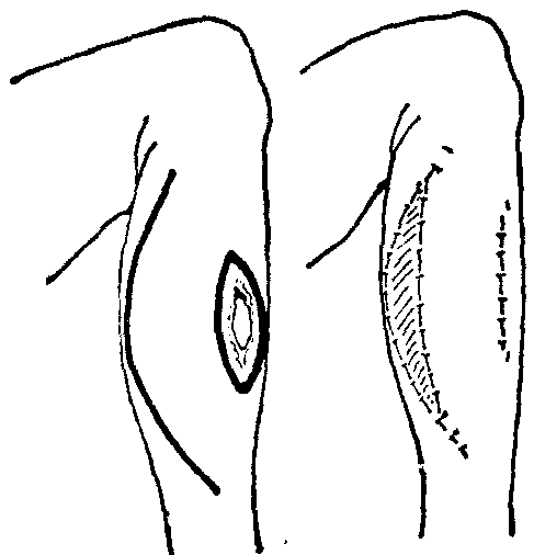 图4 旋转皮瓣 推进皮瓣 为利用缺损外围一侧的局部皮肤所形成的向缺损区作直向推进滑行移转的皮瓣。于皮瓣蒂基部两侧的外方,常各需切除一小块三角形皮肤,以消除所出现的皱褶 (图5)。