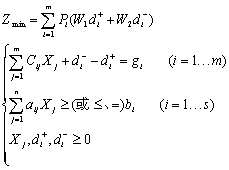 式中:gi——第i个目标(i=1…m);Cij——对目标约束的系数;di+,di-——相对于目标值的偏差。 除了一般约束和目标约束之外,还有对变量非负约束Xi≥0;di+ 、di-≥0,所以目标规划的一般形式为: