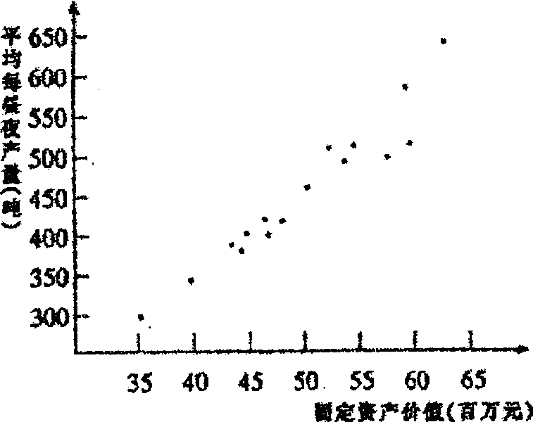 图13-2 8个同类工业企业的月产量与生产费用曲线图 通过相关图不仅可以看出变量之间是否有关系存在,而且可以近似地把关系的形式反映出来,比在相关表中反映得更为清楚和直观。从图13-1与图13-2中可以看出,所有观察点都分布在一狭长的带形区域之内,并近似地接近于直线,因此可以有根据地假设这两项资料中都有直线关系存在。如果在图上各观察点的分布接近于曲线,就可以设想其中有非直线关系存在。 ☚ 相关表 相关系数 ☛ 相关图correlation diagram |