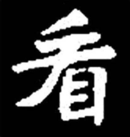 表意,小篆从手从目,表示把手搭在眼睛上部遮挡阳光,往远处望,隶定为“看”。本义读kàn,远望,引申为用眼睛直视人或物、观察判断、对待、诊治、照料、探望、拜访等;又读kān,引申为照管、监管。 【辨析】 看/视/见/睹 见86页“睹”。看 (kàn)从手,下目。亦作“𥉏”。 【按】看,《説文》:“睎也。”即以目視物。“𥉏”爲“看”的古文字形。一音kān,監視守護義。 看 *看k’an[甲骨] [金文] [小篆] 《說文》: , 睎也。 从手下目。 ,看或从倝。 (四篇上) 手遮刺眼之光線以便利觀看。 ☚ 段 扁 ☛ 看〈动〉(1)看守;守护。 《金》十三: 一个冯妈妈~门首,是奴从小儿养娘,心腹人。 《醒》四九: 姜小姐又不会~孩子,每日都是姜朝媳妇帮贴,又甚不方便。 《聊·翻》一: 留下乜两个孩子,我~着并无差迟。 (2) 看管;监督。 《醒》二九: 一日,棉花地里带的青豆将熟,叫狄周~了人拣那熟的先剪了来家。 另见kàn。