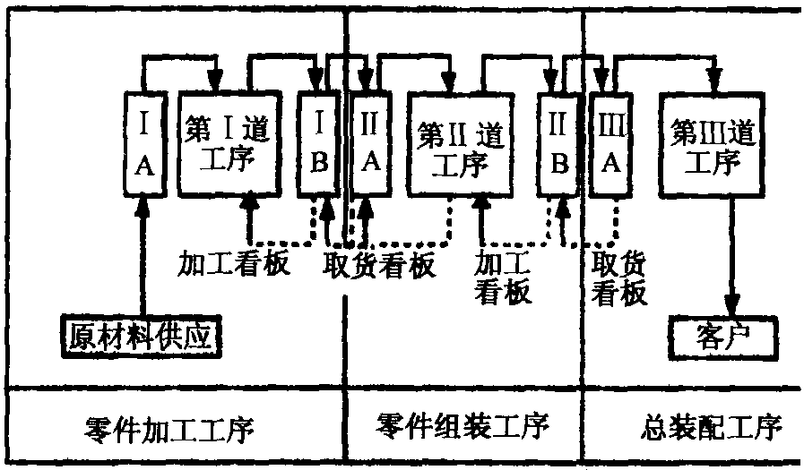 每道工序的附近均设置两个存件箱,A箱存放上道工序完工需本道工序加工的零部件。B箱存放本工序加工完毕往下道工序或定货单位传送的零部件。当最后一道工序操作人员完成了他的加工任务,传送给客户时,他即刻从该工序的A箱中取出加工看板规定数量的零部件进行该工序的加工,同时将该工序A箱上的取货看板送到相邻的上一道工序的B箱去提取取货看板上规定的数量、品种的零部件,以补充该工序A箱中的短缺。而上一道工序B箱零部件和加工看板一起被送走,它的加工看板即传给这一道工序的操作人员,操作人员按加工看板组织生产,而这道工序操作人员又要从本道工序的A箱中取零部件,加工后和加工看板一起放入B箱,该工序由于加工,使其A箱中零部件减少,于是将取货看板往该工序的前一道工序的B箱中送去,依次进行上述过程的工作,实现环环相扣,形成准时生产。 看板在编制时,要做到内容齐全,即产品名称、型号、件号、件名、每台件数、生产的工序或机台、运送时间、运送地点、运送数量、放置位置、最低标准数量等都要写清楚;要强调看板内容与实物相符;要使看板上所记载的各项内容用不同颜色标记清楚,便于识别、区分,看板要便于制造,易于保管、处理,不被油污,耐蚀,不易破损。 使用看板时要遵守以下规则:(1)一定要由下道工序到上道工序取货,消除传统的上道工序完成后往下一道工序送货的状况;(2)下道工序要带着取货看板去取货,而且一定要按看板上规定的数量取货,不可多取或少取,货在运送时必附有看板;(3)工序之间传送的货物一定是合格品,如发现是次品,一定要停止生产,查明原因,采取措施纠正。 ☚ 准时生产制 精益生产方式 ☛ 看板管理 看板管理日本丰田汽车公司副总经理大野耐一首创的一种以均衡生产为基础的产品制造管理方式。看板管理的要点是: 利用看板 (一种信息卡) 把上下道工序联系起来,组成均衡的流水作业,各道工序在必要的时候,按必需地数量生产必要的产品(零部件),达到人力、材料和设备的最有效结合,顺利而高效地进行生产。看板管理的目标是:消灭过量储备,杜绝浪费,降低成本。看板管理的具体实行办法是: (1)下一道工序向上一道工序提取零部件,以尽量避免过量储备;(2)只生产一件,只传递一件,只储备一件,以尽量避免成批制品滞留在生产过程; (3) 按最后的装配工序调节平衡整条流水线; (4) 宁可中断生产,决不积压储备。看板管理方式提出以后,已经在日本的汽车工业和其他制造工业中得到了普遍的采用,并且不断地趋于完善,取得相当大的经济效益和竞争优势。 ☚ 末日管理 权变管理 ☛ 看板管理 看板管理亦称“看板方式”、“视板管理”。在工业企业的工序管理中,以卡片为凭证,定时定点交货的管理制度。“看板”是一种类似通知单的卡片,主要传递零部件名称、生产量、生产时间、生产方法、运送量、运送时间、运送目的地、存放地点、运送工具和容器等方面的信息、指令。一般分为:在制品看板,它用于固定的相邻车间或生产线; 信号看板,主要用于固定的车间或生产线内部; 订货看板 (亦称“外协看板”),主要用于固定的协作厂之间。看板管理的要点是: 把“看板”作为传达生产指令,反馈指令执行情况的工具,从最后一道工序起,步步向前追溯,直到原材料准备部门,使各个生产环节都能畅通运行,使实物流通处于最佳状态,通过“准时领货”、“准时运送”、“准时生产”,达到提高产品质量,缩减工时,减少库存、防止事故。这种管理由日本丰田汽车公司1962年首创并推行。 ☚ 生产调度 产品质量 ☛ 看板管理card control |