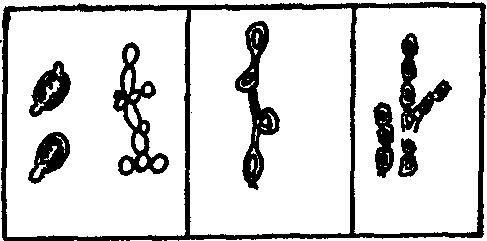 图 2 真菌的无性孢子 有些真菌菌丝断裂后产生一些其他类型的无性孢子。如粉孢属产生的粉孢子和地霉属产生的节孢子;有些在菌丝顶端或中间产生一个厚壁休眠孢子,如总状毛霉产生的厚垣孢子,具强抗逆力;还有芽生方式生成的芽孢子,如假丝酵母和玉米黑粉菌。 有性繁殖 包括两个可亲合性核的结合,经一定过程产生有性孢子。首先是进行质配,带有单倍体核(N)的原生质配合,细胞中成对的核称双核或结合核,常以(N+N)来表示核染色体数,仍为单倍体核; 其次是核配,两个核进行配合,产生二倍体核(2N);最后由核配生成的二倍体核发生减数分裂,形成4个单倍体核(N)。含单倍体核的细胞以后发育成单倍体的营养体。有些真菌在质配后随即进行核配,双核期很短;有些质配后要经相当长时间才进行核配,双核期较长。同时减数分裂发生的时期也有不同。不同真菌产生不同类型的有性孢子(图3)。