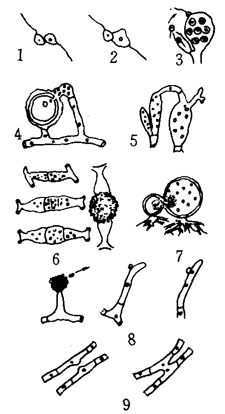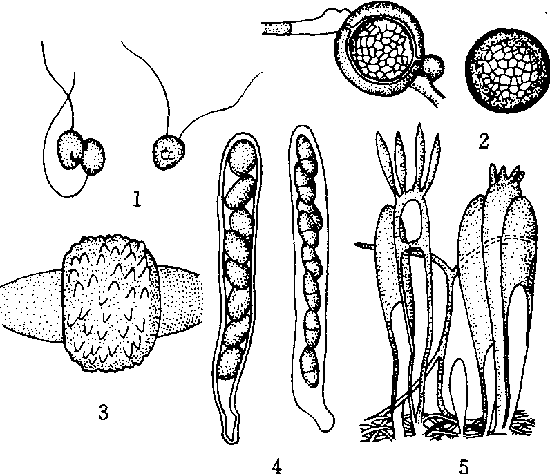 配子囊配合 两个配子囊接触的壁消解融合成一个新细胞,并在其中进行质配、核配和减数分裂,如接合菌。 受精作用 有些真菌在精子器(性孢子器)或性孢子梗上产生大量、小型的单核精子,借助昆虫、风、水等媒介带到受精丝或营养菌丝上,在接触点形成小孔,精子内的全部内含物输入对方以完成质配过程,如一些子囊菌和锈菌。 体细胞结合 有些真菌性器官退化,营养细胞代替了性器官的功能。例如一些酵母菌单细胞营养体可以成对地融合成一个单细胞接合子;某些子囊菌由两根亲和性菌丝发生融合,细胞核通过隔膜穿孔到达产囊体;许多担子菌则是通过可亲和初生菌丝间的融合来完成质配;某些壶菌,质配是由假根丝状体的融合来完成的。 核配 由质配带入同一细胞内的两个亲本的核进行配合。核配的结果形成二倍体细胞。由质配产生的双核细胞中,来自双亲的2个细胞核或随即核配,或独立分开,经过一定时期后进行核配,或通过双核并裂产生新的双核细胞(见真菌倍体性)。双核期的长短因真菌种类不同而有较大差异。在许多低等真菌中,质配后很快进行核配,双核期不明显。而许多担子菌在质配后要经过很长时间才进行核配,双核期明显。子囊菌的双核期通常较短(见真菌生活史)。在 一些真菌中,质配和核配可以在不同的场所进行,如禾柄锈菌,质配和核配分别发生在受精丝和冬孢子中。 减数分裂 核配产生的二倍体细胞核发生染色体数目减半的分裂,形成单倍体细胞核。单倍体核连同周围的原生质共同发育成有性孢子。在一些真菌中,二倍体细胞核可能保持到有性孢子萌发时才发生减数分裂。 真菌的有性生殖过程及细胞核倍性变化可以用以下简图表示(仿张中义,1986): 质配(n+n)—→[双核阶段(n +n)]—→核配(2 n)—→减数分裂(n)。 营养体为二倍体的真菌,如卵菌,其有性生殖过程与单倍体真菌在顺序上明显不同,依次为减数分裂、质配和核配。进行有性生殖时,部分营养体顶端或中间细胞膨大分化出雌、雄配子体,二倍体核在配子囊内发生减数分裂。单倍体雄核以配子囊接触的方式进入藏卵器与卵子的核结合(卵配生殖),发育成二倍体的卵孢子。 有性孢子的类型 主要包括休眠孢子囊、卵孢子、接合孢子、子囊孢子、担孢子(图2)。 休眠孢子囊 通常是由两个游动配子所形成的合子发育而成,壁厚,为双核体或二倍体,萌发时发生减数分裂释放出单倍体游动孢子,如许多低等鞭毛菌。 卵孢子 以卵配生殖方式产生的孢子,如鞭毛菌中卵菌的有性孢子,为二倍体。卵孢子大多球形,壁厚,包裹在藏卵器内,通常需经过一定时期休眠后才能萌发,可以抵抗不良环境。卵孢子萌发产生芽管直接形成菌丝或先在其先端产生游动孢子囊。每个藏卵器内含一至多个卵孢子,藏卵器内卵孢子数目因不同物种而有较大差异。 接合孢子 接合菌的有性孢子,由配子囊配合方式产生,是一种二倍体孢子。接合孢子被厚壁的接合孢子囊所包被,通常需经较长时间的休眠才能萌发,可抵抗不良环境。萌发时细胞核发生减数分裂,接合孢子长出芽管,通常在顶端产生一个芽孢子囊,有的直接伸长形成菌丝。