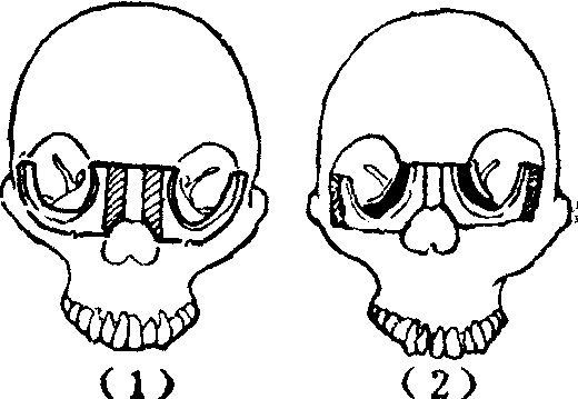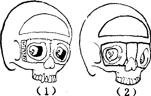 图3 颅下眶骨截骨术 经颅内矫正也有两种方法: ❶ 保留额骨横梁的方法。其原则是先在前额部掀开颅骨瓣,当截开颅骨时,于两侧眶上缘上方保留1 cm宽的横向骨梁。经掀开骨瓣的创口,在硬脑膜外,于眶顶上方至蝶骨翼点和小翼范围内,游离大脑额叶,向内至筛板的两外侧缘。然后在颅面额鼻部行包括颅底、鼻部、筛骨、上颌骨等的截骨术,以取除一中央部骨块。并行眶底、眶外侧壁、眶顶的截骨术,使两眶部完全游离,互向中线推移会聚固定。因有保留的额骨横梁为基准,可以保证内移后两眶部的水平方向和前后位置的对称一致。眶内移后,如引起鼻道堵塞,可将两侧梨状孔边缘作适当凿除。截骨和移位后,所形成的骨缺损裂缝,可用自体骨移植充填(图4)。 ❷保留额骨两侧尖角的方法。偶于有额部脑膨出或先天性骨缺如病例,无法保留额骨横梁时,可改用此法。本法与前一方法的基本原则相同,其不同点为在每侧保留一额骨尖角,用以代替横梁,作为两眶向内移动的基准(图5)。经颅内矫正术适用于畸形严重,和有颅前窝内疾患 (如额或鼻部脑膜膨出或脑膜脑膨出),或筛板位置低于额鼻缝的病例。手术过程中须密切注意防止视神经、动眼神经的损伤。