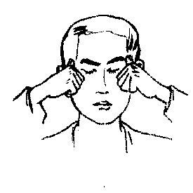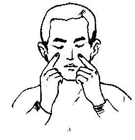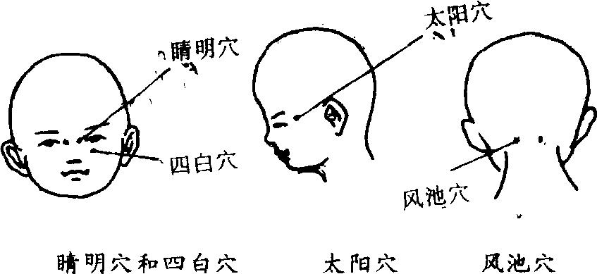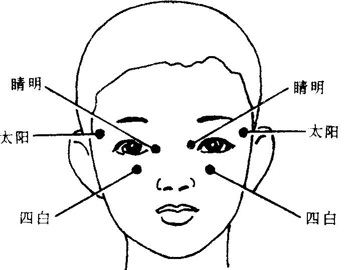 图6.3-1 眼保健操穴位 ☚ 正视眼与非正视眼 写字和绘画卫生 ☛ 眼保健操 眼保健操预防近视的医疗性操练,是吸取中国传统经络学说,以穴位按摩原理选编而成,也是用穴位按摩手法达到保护视力、预防近视眼的身体操作。