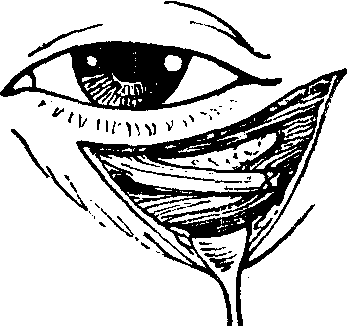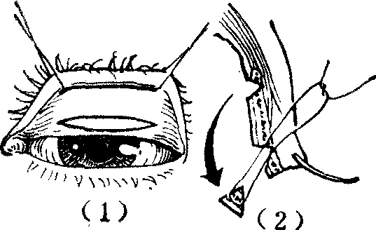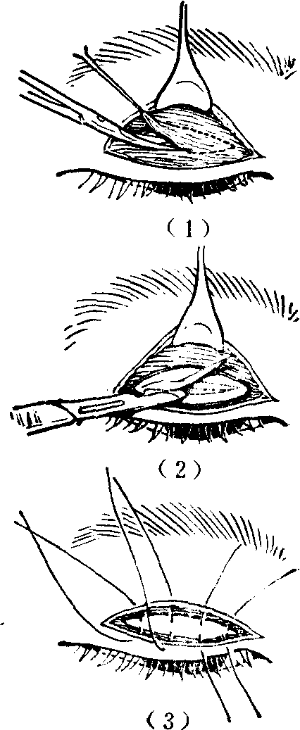 图1 眼轮匝肌肌瓣紧缩缝合术矫治退行性眼睑内翻 (4) 睑结膜或结膜下瘢痕,如睑球粘连,以及最常见的因砂眼所引起的瘢痕性睑内翻。睑球粘连时的内翻,睑缘正常,治疗时应设法将粘连分离松解,内翻即可随之获得矫正。砂眼等所致瘢痕性内翻,睑缘多有变形。治疗可视内翻程度的轻重选用适当方法。程度轻微者,可将向眼球倾倒的局部睫毛行电解脱毛术去除。程度严重者,睑板组织增厚,并呈凹面过度向内的弯曲弧面变形时,可行Hotz手术,或睑结膜睑板楔状复合组织游离移植术矫治才可望收效。 Hotz手术,适用于上睑瘢痕性内翻。手术原则,为顺沿相当正常睑缘上皱襞部位所作切口,根据内翻程度的轻重,在切口上缘切除一块宽度适当的梭形皮肤及位于其底层的眼轮匝肌(图2 (1))。显露睑板,用锐刀将增厚的睑板组织削薄(图2(2))。缝合时,由创口近睑缘侧皮肤引入缝线,穿连睑板前层组织,再从另侧创缘牵出缝线。缝线暂勿结扎,俟缝合完毕,再一一收紧打结(图2 (3))。缝合后,可使睑缘区皮肤与睑板愈着,并将睑缘向外翻转。缝合时穿连睑板的位置愈高,则向外翻转的作用愈强。如原为单眼皮,术后可出现双眼皮。