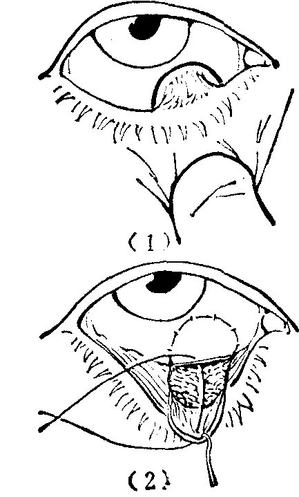 (1)上睑结膜瓣形成后向下睑推进移转; (2)结膜瓣修复下睑创面,缝合后睑裂封闭; (3)切开,重建睑裂。