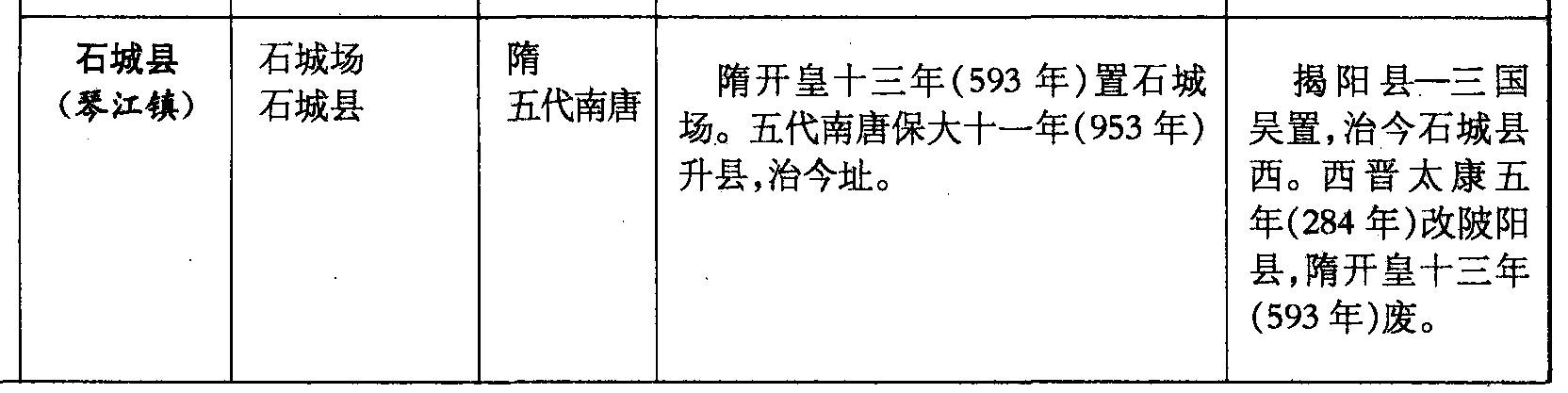 石城县(琴江镇)石城场石城县隋五代南唐隋开皇十三年(593年)置石城场。五代南唐保大十一年(953年)升县,治今址。揭阳县—三国吴置,治今石城县西。西晋太康五年(284年)改陂阳县,隋开皇十三年(593年)废。