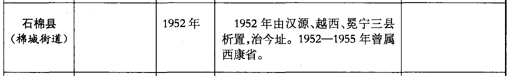 石棉县(棉城街道)1952年1952年由汉源、越西、冕宁三县析置,治今址。1952—1955年曾属西康省。