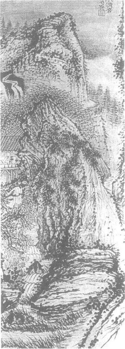 立轴,纸本,水墨。此图构图奇特,山体尤如通天石壁布满画面。山石跌宕错落,岩缝间奇松突起,竹叶密布。一瀑布山头几经回曲,于竹林山岩间时隐时现。山下水面逐渐加宽,注下深潭。山间高人隐士结庐数间,于松涛泉涌声中,更觉其宁静清幽。