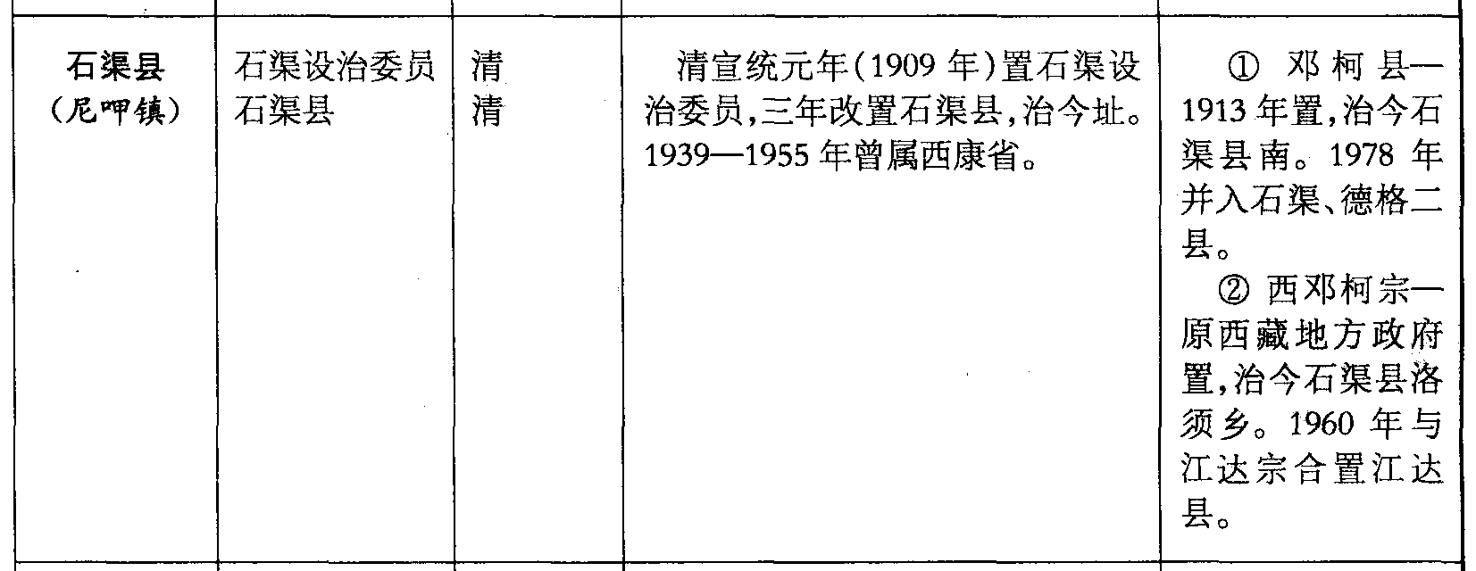 石渠县(尼呷镇)石渠设治委员石渠县清清清宣统元年(1909年)置石渠设治委员,三年改置石渠县,治今址。1939—1955年曾属西康省。❶ 邓柯县—1913年置,治今石渠县南。1978年并入石渠、德格二县。❷ 西邓柯宗—原西藏地方政府置,治今石渠县洛须乡。1960年与江达宗合置江达县。