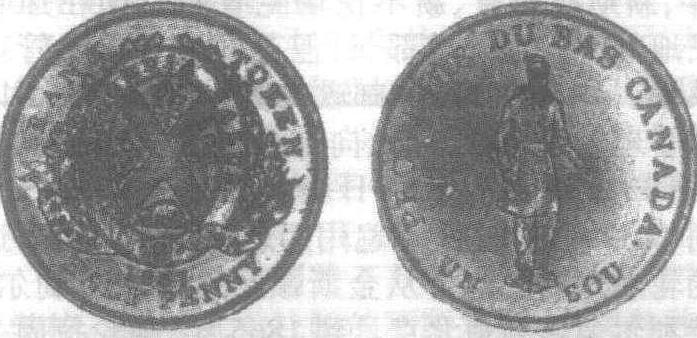 1837年下加拿大发行的半便士硬币。左为正面,右为反面。 加拿大北部 最早使用的是当地的辅币。1812年发行一种半便士轻币。1825年后,半便士轻币被另一种硬币所替代。还流通过两便士的硬币。加拿大统一后,蒙特利尔银行、北部银行和魁北克银行等相继发行铜币。在北部的哈得孙湾,钱币很少使用,毛皮交易通常是以物易物。1861年,该地区出现过少量英国银币和金币。 1858年,加拿大省(今魁北克和安大略南部地区)货币开始采用十进制,随后新不伦瑞克、新斯科舍、纽芬兰和爱德华王子岛也相继采用十进制,出现5分、10分、20分的银币和铜币。1870年至今,加拿大自治后第一次发行面值5分、10分、20分和50分的银币。1876年又发行铜币。各种硬币的正面均为维多利亚女王的头像。1902年,爱德华七世的头像替代了维多利亚女王头像。1911年,乔治五世的头像又替代爱德华七世的头像。后来分币面积缩小,5分银币也改为镍币。1935年,为庆祝乔治五世登基25周年,首次发行银元。直至1967年,加拿大每年(除战争年代)都要发行银元,其间还发行过金币。1937年乔治六世继位后发行一组新币,正面是乔治六世头像,背面的图案则不同。加拿大很少发行金币,多使用美国金币。1953年,硬币用伊丽莎白二世的半身像替代了乔治六世的头像。1967年为纪念联邦成立100发行一套硬币,正面是女王的半身像,背面是各种不同的图案。1968年8月,镍币替代银币在市上流通。1987年,一种新的1元硬币替代1元的纸币。
