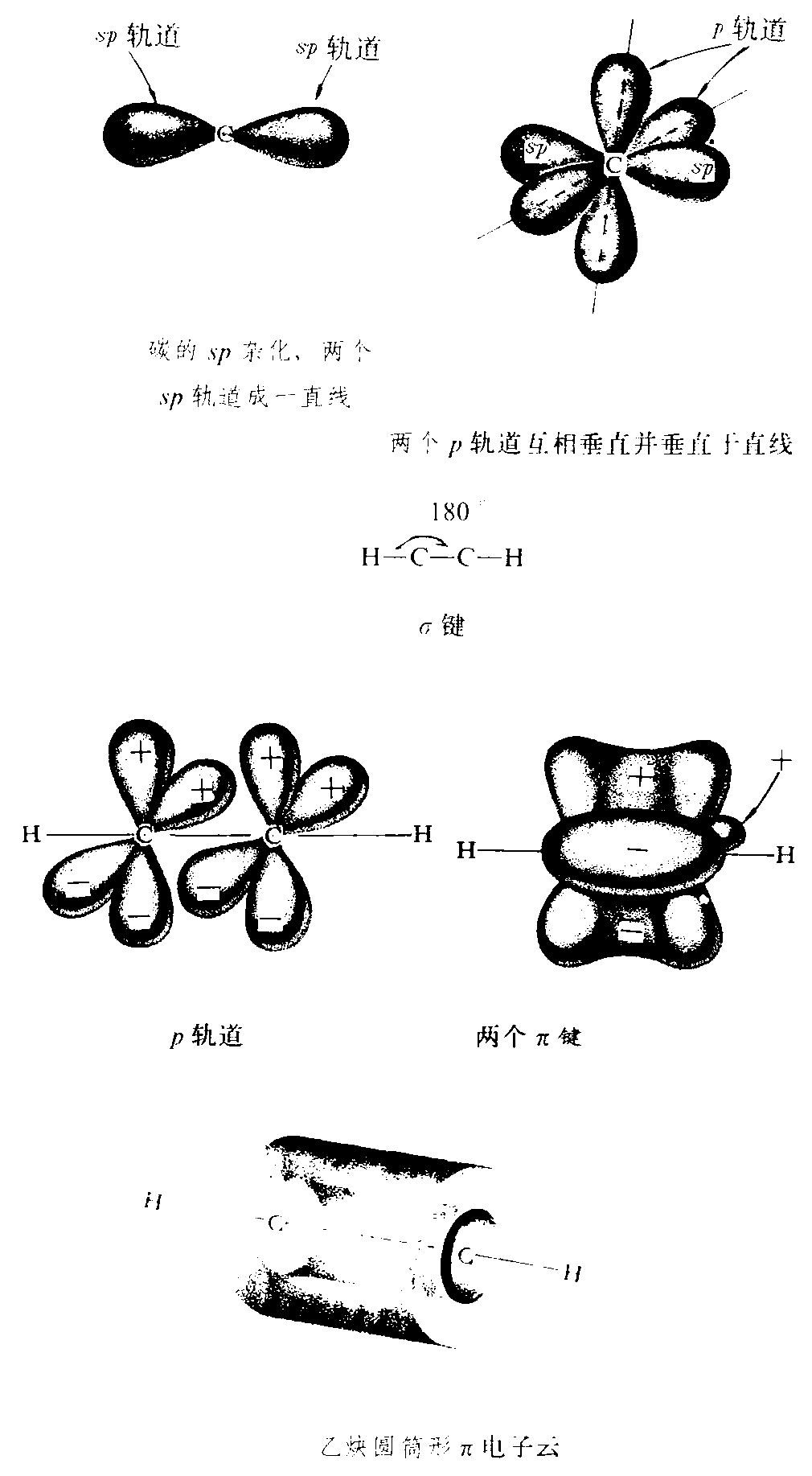 指在两个碳核之间共享3对电子。在乙炔分子中碳核是以叁键相连的,乙炔是叁键化合物中最简单者。烃类化合物中含叁键的称为炔烃。在乙炔分子中,碳碳键长0.120nm,比乙烯、乙烷中的碳碳键都短,碳氢键长0.108nm。所有原子处在 一条直线上,CCH键角为180°,乙炔比乙烯分子更紧密。近代分子轨道理论认为乙炔碳原子为sp杂化,两个sp杂化轨道角度为180°,形成 一条直线,两个p轨道保持未杂化,每 一个sp杂化的碳与氢形成一 个σ键,与第二个碳形成一个σ键,相邻的两个平行p轨道重叠形成两个π轨道,组成叁键的3个键中两个键是π键,另一个是σ键。乙炔分子的两个π键电子云是圆筒形对称的,围绕在碳碳键轴外,π键的电子屏蔽了碳碳σ键电子,每个π键比σ键更容易破裂(见下图)。
