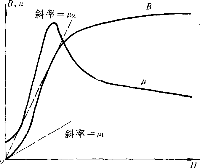 | 释义 | 磁导率 磁导率cidaolu描写磁介质磁化性能的物理量。一般用μ表示,又称绝对磁导率。顺磁质和抗磁质中磁感应强度B与磁场强度H之间有B=μH。于是有μ=B/H。μ值由磁介质的磁性决定,而与B、H无关。在国际单位制中磁导率的单位是特斯拉·米/安。通常多使用相对磁导率μr,且μr=μ/μ0。式中μ0=4π×107特斯拉·米/安,是真空磁导率。因此,相对磁导率μr是无量纲的纯数。顺磁质μr>1,抗磁质μr<1,但二者都非常接近于1,其值由物质的磁性决定,与B、H无关。相对磁导率与磁化率的关系由式μr=χm+1决定,式中χm是磁化率。一般来讲,式B=μH对铁磁质不成立,但对软磁材料(见铁磁质),由于其磁滞回线窄长可用起始磁化曲线代替磁滞回线,并求出起始磁化曲线所约定的磁导率,此时仍可用μ=B/H定义磁导率。由于软铁磁材料B—H间的非线性关系(如图所示),导致不同H处μ值不同。由定义式可知,起始磁化曲线上各点的斜率即表示对应于各H值的磁导率,用图中的μ—H曲线表示。实用图表中常取起始磁导率和最大磁导率表示铁磁质的性能。起始磁导率是H趋于零时磁导率的极限值,即图中的μ1;最大磁导率是指μ—H曲线上μ的最大值,即图中的μM。已知一种材料的磁导率后,用它除以μ0就可得到相对磁导率μr,再由μr=χm+1求得磁化率χm。根据磁导率(或磁化率)的特点把磁介质分为三类:顺磁质、抗磁质、铁磁质。其特征列表如下: