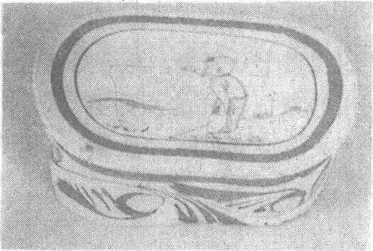 宋。前高7.7厘米,后高10厘米。1955年河北省邢台市出土。河北省博物馆藏。形制为腰圆形,是宋代瓷枕中一种流行式样。枕壁四周以黑彩绘卷叶纹,枕面有一幅儿童垂钓图。画面上为一个留孩儿发、穿长袍的男童,站在杂草丛生的河边垂钓。他那专注的神态,前倾的身体,粗制的鱼竿和水中即将上钩的鱼儿,组成了一幅平凡而又极具生活情趣的图画。磁州窑见“磁州窑鞠球图瓷枕”条目。