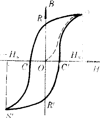 铁磁质沿起始磁化曲线(图中OS曲线)达到饱和磁化状态S点后,磁场强度又从Hs逐渐减小到零,得出SR段曲线。它与起始磁化曲线不重合,B(或M)减小的程度落后于H,这种现象称为磁滞。H=0时的磁化强度和磁感应强度分别称为剩余磁化强度和剩余磁感应强度,简称剩磁。通常分别用MR和BR表示。永磁铁就是利用剩磁制成的。H由零减至Hc时得出图中RC段曲线。 当H=-Hc时, B=0(B≈ M,所以此时M≈0),这说明使铁磁质完全消除剩磁需加反向磁场Hc,Hc称为矫顽力。因为H=B/μ0-M,严格地说使B=0与使M=0所需的矫顽力不一样,应当区分使M=0与使B=0的矫顽力。在矫顽力不大时(即在H≪M时,B=μ0(H+M)≃μ0M)认为二者矫顽力一致(即B=0时M=0)。矫顽力的大小反映了铁磁材料保存剩磁状态的能力。正是按矫顽力的大小把铁磁质分成硬磁材料和软磁材料。当反向磁场继续增加铁磁质沿反方向磁化(M<0),直至达状态S'时,反向磁感应强度(或磁化强度)达到饱和,得到图中CS'段曲线。将H从— Hs变到零,再由零增大H到Hs,则得到图中S'R'、R'C'、C'S'段曲线。最后形成了SRCS'R'C'S闭合曲线,即图中的B—H磁滞回线。 依式M=B/μ0—H很易由B—H曲线求得对应的M,从而求得M—H磁滞回线。磁滞回线反映了铁磁质的磁化性能。它说明铁磁质的磁化是比较复杂的,铁磁质的M、B和H之间的关系不仅不是线性的,而且不是单值的。亦即对于一个确定的H,M、B的值不能唯一确定,同时还与磁化历史有关。不同的铁磁质有不同形状的磁滞回线,不同形状的磁滞回线有不同的应用。例如永磁材料要求矫顽力大,剩磁大;软磁材料要求矫顽力小;记忆元件中的铁心则要求适当低的矫顽力。为了满足生产、科研中新技术的需要就要研制新的铁磁材料使它们的磁滞回线符合应用的要求。磁滞回线为选材提供了依据。可以证明B—H磁滞回线所围面积与磁滞损耗成正比,在交流电器中磁滞损耗是有害的,它的存在既浪费了电能又使铁心发热,对设备不利,所以软磁材料的磁滞回线所围面积要尽量减小,以减少损耗。 ☚ 饱和磁化强度 剩余磁化强度 ☛ 磁滞回线铁磁物质进行交变磁化过程中的磁化曲线(即B—H曲线)。H为磁场强度,B是铁磁体的磁感应强度。当铁磁体被磁化后,再去磁时不能回复到原来的状态0,而是有剩磁0b。这样当外磁场强度从Hm变到—Hm,再从—Hm变到Hm时,形成的回线。参见“物理”中的“磁化”。 |