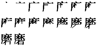 【提示】起笔是侧点,旧字形是竖点。木,中间是竖,不是竖钩; 位于字或部件左边时,末笔捺改点。里面的林, 旧字形作𣏟。 *磨mó16画 麻部 (1) 摩擦: 手上~出老茧|鞋底~破了|~嘴皮子。 (2) 将金属器具、玉石等与刚硬的物质(磨料)反复摩擦,以达到使其光滑、锋利等目的: ~玉|~刀|~墨|研~|临阵~枪。 (3) 折磨: 这场病把他~瘦了许多。 (4) 纠缠: ~蹭|软~硬泡。 (5) 因时间久而逐渐消失: ~损|消~|不可~灭。 另见mò(282页)。