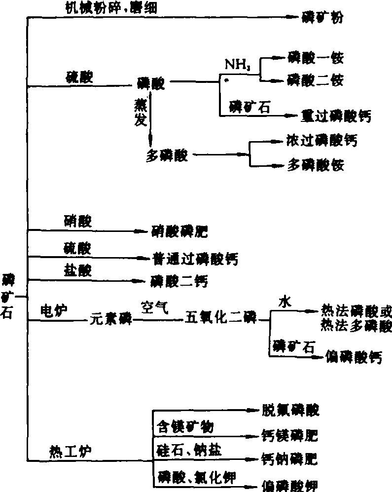 但磷肥施用不当,也会引起某些不良作用,例如,磷肥施用过多,作物呼吸作用过强,糖分大量消耗,造成如谷类作物瘪粒增多,烟草燃烧性变差,影响产量和品质;同时又会引起作物锌、铁、镁等营养元素缺乏,而导致产量和品质的降低。 简史 世界上最早的磷肥是骨粉,中国远在汉朝(公元前100年)已知骨粉肥田,在欧洲,1775年J.亨德尔(Hunter)提议利用骨头作肥料,到19世纪30年代前后,在苏格兰等地建立了骨肥制造厂,骨粉在英国、德、苏联等国家开始广泛应用,但是,它作肥料直接施用的状况很快为矿质磷肥所代替。 1818年法国首先发现天然磷酸盐矿床,开始磷矿粉的直接施用。40年代制造普通过磷酸钙获得成功后,磷肥工业迅速发展,到20世纪50年代初,其生产量已超过氮肥的2倍。自此以后,由于磷肥需要量和磷矿资源等因素的限制,氮肥生产量逐渐超出了磷肥。 在20世纪40~50年代,随着湿法磷酸生产工艺的进步和设备材料的腐蚀问题得到基本解决,世界磷肥品种结构发生了明显的变化,即由低浓度磷肥向中、高浓度磷肥发展,进入80年代,如美国、摩洛哥和突尼斯等主要磷肥生产国在生产磷肥的品种结构中重过磷酸钙、磷酸铵、聚磷酸铵等高浓度磷肥生产已占绝对优势。在磷肥工业史上占主导地位达百余年之久的普通过磷酸钙,因有效成分低而逐渐被淘汰。 中国的磷肥生产起步较晚,20世纪40年代初,在云南昆明曾建成小型过磷酸钙生产车间,1953年开始利用国产磷矿石制磷肥,1957年在南京年产40万吨过磷酸钙厂投产,随后建成了一批中小型过磷酸钙厂,同时开发了高炉生产熔融钙镁磷肥的方法,使磷肥生产量迅速增长。1987年产量为325.9万吨(P2O5),其中含P2O5为12%~18%的普通过磷酸钙和14%~20%的钙镁磷肥占磷肥产量的97.7%。高浓度磷肥生产始于1967年南京磷酸铵生产装置的建成,1982年在云南建立重过磷酸钙厂,80年代末,在南京等地扩建和兴建能生产磷酸铵等高浓度磷肥(包括复合磷肥)的工厂。 资源 生产磷肥的最主要原料是磷矿石。世界磷矿分布很广,据 1985年资料,其总蕴藏量约为144 212×106吨,比较集中分布在美国(38 790×106吨)、摩洛哥(40 000×106吨)、苏联(7 125×106吨)及西属撒哈拉(16 600×106吨)等国家和地区。据1984年统计,世界开采磷矿石总产量已达14 930万吨产品。其中美国居世界首位,苏联居世界第二位,摩洛哥占世界第三位。中国磷矿资源也很丰富,据1984年统计资料,已探明的磷矿石总蕴藏量约为9 000×106吨,其中,沉积的磷块岩约占3/4,其次为岩浆岩和变质岩矿床,以及少量淋滤洞穴堆积和生物堆积矿床。主要分布在西南和中南地区,如贵州、四川、云南等省。磷矿石年开采量到1980年约为1 000万吨,居世界第四位。中国矿石品位特点是,大于30%P2O5的矿石不足10%,其余均为P2O5量在28%以下的中低品位磷矿石,且大多属于硅钙质的沉积磷块岩(以P2O5量计约占工业储量的70%),选矿较难,工业利用价值低,只宜就地磨细成磷矿粉肥施用。 鸟粪层磷矿是鸟类的直接或间接的堆积物矿化而成,中国的东沙、西沙、中沙和南沙等南海诸岛有分布,全磷含量高,是一种高品位的磷矿资源。动物骨骼也是一种良好的磷肥来源,由于它大多用于饲料添加剂等,直接作肥料施用的为数甚少。钢渣磷肥是炼钢工业的副产品,由碱性物质与钢水中的磷结合成渣形成,是磷肥来源之一。20世纪50年代以前在欧洲的酸性土壤上已广泛施用。 种类 分为天然磷肥(如磷质海鸟粪、兽、鱼骨粉和磷矿粉等),化学加工磷肥(如过磷酸钙、钙镁磷肥和脱氟磷肥等),另外还有复合磷肥如磷酸铵、硝酸磷肥。也可按磷肥中所含磷酸盐的溶解性能分为三类:即水溶性磷肥,枸溶性磷肥和难溶性磷肥。它们可分别由酸制法、热制法或机械法制得(图2)。