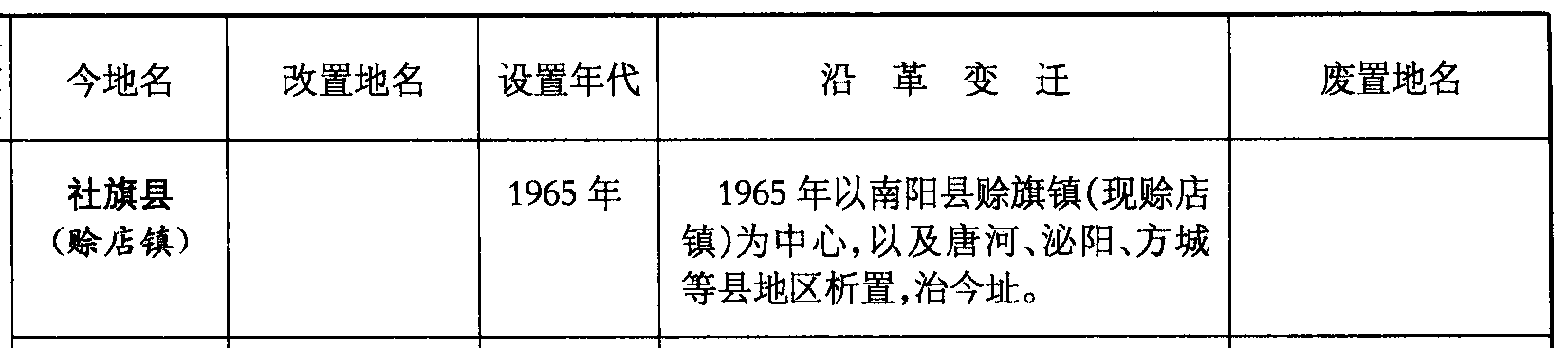 社旗县(赊店镇)1965年1965年以南阳县赊旗镇(现赊店镇)为中心,以及唐河、泌阳、方城等县地区析置,治今址。
