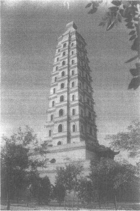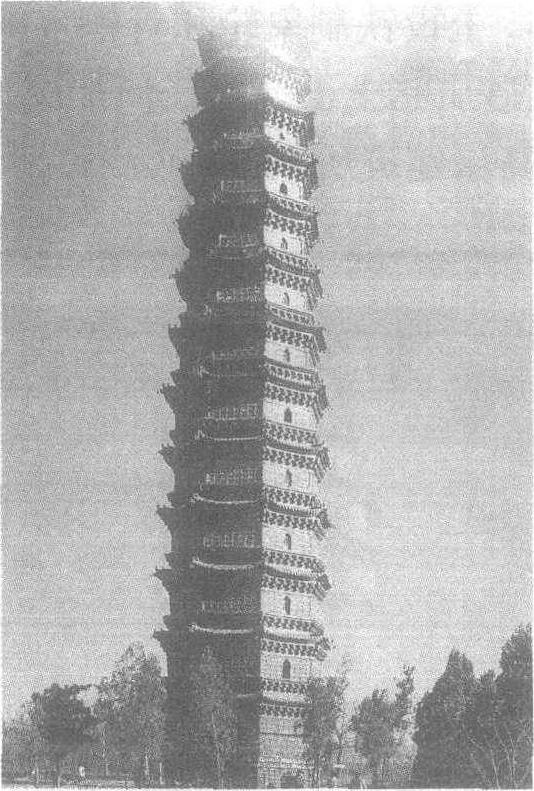 祐国寺塔 ☚ 小雁塔 神通寺四门塔 ☛ 祐国寺塔 祐国寺塔全国重点文物保护单位。位于市东北隅。因塔外壁镶以褐色琉璃砖,近似铁色,俗名铁塔。又因原建于开宝寺内,又称开宝寺塔。开宝寺在北宋年间规模宏伟,有二百八十区,设福胜、上方、永安、能觉等二十四禅院。考选举子的礼部贡院亦设此。北宋历代皇帝常来此游幸。铁塔前身是木塔,传说为我国古代著名建筑学家喻皓所建,八角十三层,高120米,为供奉佛祖释迦牟尼舍利而建。宋庆历四年(1044)毁于雷火。皇祐元年(1049),宋仁宗下诏在不远处的夷山上依木塔样式重建,即今铁塔。清道光二十一年(1841)黄河泛滥,水灌开封,寺毁塔存,但塔基已埋于地下。塔高55米,八角十三层,为仿木构楼阁式砖塔。塔身遍砌褐色琉璃砖,塔砖如同斧凿木料,有榫有眼,有沟有槽,严密合缝。据统计,塔的外部采用经过精密设计的二十八种标准砖型拼砌而成。塔身砌有仿木结构门窗、柱子、斗栱、额枋、塔檐、平座等。琉璃砖面饰以飞天、麒麟、游龙、雄狮、坐佛、立僧、伎乐、花草等图案50余种,雕工精细,神态生动,为宋代琉璃砖雕艺术佳作。檐上葺以黄瓦,檐下四周悬104个铃铎,每当风度云穿,清音幽韵播向远方。塔的造型挺拔秀丽,俨如擎天巨柱。塔内有砖砌螺旋式踏道168级,将塔心柱与外壁连成一体,形成抗震体系。游人可直达塔顶远眺古城风貌。“铁塔行云”是宋以来胜景之一。铁塔已历千年,并经无数次地震、水患、兵火,仍巍然屹立。今塔身向东南方向倾斜约八度。塔南八角亭内有宋金时铜像一尊,高5.14米,重11.7吨,亦为珍品。 ☚ 相国寺 延庆观玉皇阁 ☛ 祐国寺塔北宋寺塔。位于河南省开封市东北隅。建于北宋皇祐元年(1049年)。因塔位于开宝寺内,故名 “开宝寺塔” 。明改称 “祐国寺塔” 。塔身以褐色琉璃砖瓦镶砌,远看近似铁色,从元代起俗称 “铁塔” 。现高55.08米,八角形,13层,为楼阁式砖塔。因黄河泛滥,塔座及座下八棱方池,于清道光二十一年(1841年)被水淤埋地下。塔身全部构件用28种标准砖砌筑成各种仿木结构,飞檐斗拱,色泽晶莹。造型宏伟挺拔,如擎天巨柱。塔身外壁镶嵌的琉璃砖雕有飞天、降龙、麒麟、坐佛、立僧、菩萨、雄狮、伎乐、力士、花卉等50多种图案花纹,为宋代砖雕艺术佳作。塔内有塔心柱,各种外壁砖瓦构件通过磴道与塔心柱紧密衔接,形成抗震体系。900多年来,历经多次地震、水患、兵火,至今仍巍然屹立。登塔眺望,古城历历在目。