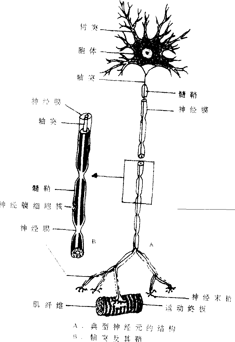 图1.12-2 一个典型的神经元的结构 ☚ 神经系统的组成和机能 神经胶质细胞 ☛ 神经元neuron又称神经细胞。动物体接受信息、传导冲动及释放神经递质的多突起细胞。分细胞体和细胞突起两部分。胞体包括核及核周细胞质(核周质),核大,圆或椭圆,常染色质多,核仁明显。核周细胞器多。有丰富的粗面内质网和多聚核糖体,表现细胞旺盛的生物合成功能。有大量神经原纤维,参与胞内物质代谢和递质运输等活动。胞体形态、大小都不定,与突起的数目、长短及发出位置有关。突起亦称神经纤维,据形态和功能差异分轴、树突两类。因神经元种类繁多,形态、大小、结构及功能不尽相同,分类标准有据突起形态数量分多极、假单极和双极神经元;以功能状态分感觉、运动和中间神经元。 神经元人体神经系统的基本单位,由胞体和突起两部分构成。突起分为树突和轴突。树突自胞体伸出,有一个或多个,而轴突每一个神经元仅发出一条,其长短不一,长者达1 m以上,短者仅10 μm。不同神经元胞体形状、大小各异,直径为5~135 μm不等。 神经元 神经元shenjingyuan神经元即神经细胞,是构成神经系统结构的基本单位。神经元是具有长突起的细胞,它由细胞体和细胞突起构成。细胞体位于脑、脊髓和神经节中,细胞突起可延伸至全身各器官和组织中。细胞体是细胞含核的部分,其形状大小有很大差别,直径约4~120微米。核大而圆,位于细胞中央,染色质少,核仁明显。细胞质内有斑块状的核外染色质(旧称尼尔小体),还有许多神经元纤维。细胞突起是由细胞体延伸出来的细长部分,又可分为树突和轴突。每个神经元可以有一或多个树突,可以接受刺激并将兴奋传入细胞体。每个神经元只有一个轴突,可以把兴奋从胞体传送到另一个神经元或其他组织,如肌肉或腺体。根据细胞体发出突起的多少,从形态上可以把神经元分为3类: (1) 假单极神经元,胞体近似圆形,发出一个突起,在离胞体不远处分成两支,一支树突分布到皮肤、肌肉或内脏,另一支轴突进入脊髓或脑。(2) 双极神经元,胞体近似梭形,有 一个树突和一个轴突,分布在视网膜和前庭神经节。(3) 多极神经元,胞体呈多边形,有一个轴突和许多树突,分布最广,脑和脊髓灰质的神经元一般是这类。根据神经元的机能,可分为感觉 (传入) 神经元,运动 (传出) 神经元和联络 (中间) 神经元3种。神经元的功能总体来说是: 受到刺激后能产生兴奋,并且传导兴奋