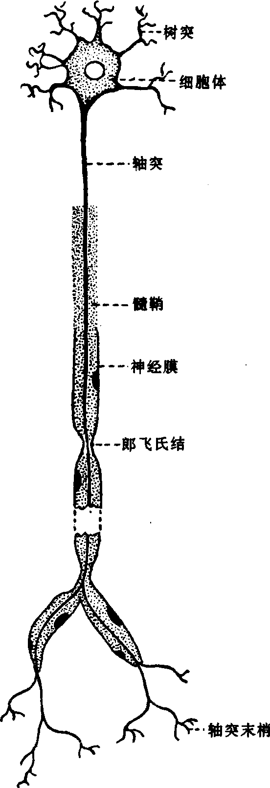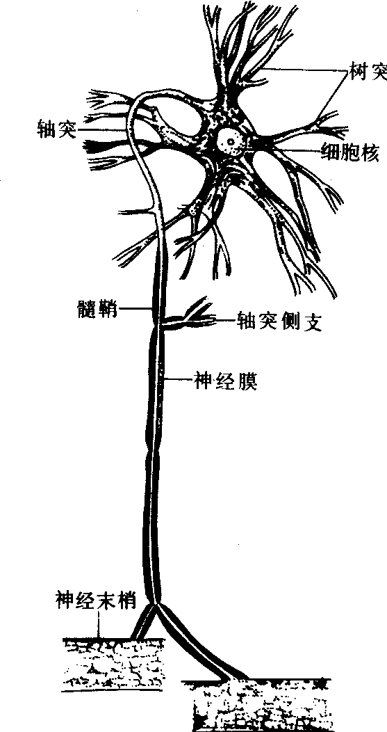 图2 神经元胞体的模式图 轴突起自轴丘,也常起自树突基部。在光镜下,轴丘中无尼氏体。轴突自轴丘起始至髓鞘开始的一段为起始段,动作电位起于此部。轴突的侧支以直角发出,末梢分支多呈终纽样,与其它神经元形成突触。轴浆内含有除胞体中尼氏体和高尔基复合体以外的一些细胞器。胞体中合成的蛋白质物质沿轴浆流向末梢称为轴浆流,是顺行的,含神经递质的囊泡传递较快,维持轴突生存和生长的蛋白质等传递较慢。逆行流动也存在,某些物质可自神经末梢传至胞体,称为逆轴突传递。 ☚ 神经系 突触 ☛ 神经元 神经元neuron亦称“神经细胞”。神经系统的基本结构、功能单位。结构分为细胞体和突起两部分。细胞体由细胞膜、细胞质和细胞核组成。突起分成树突和轴突,是细胞质的丝状延伸物。轴突较长而分支少,外有或无髓鞘,构成神经纤维;树突较短而分支很多,形成树状,存在于中枢神经系统和神经节内,通过细胞突起,与其他神经元或效应器官相接触。功能为接收、储存和传递信息。按照结构分为单极神经元、双极神经元和多极神经元;按照功能分为感觉神经元、中间神经元和运动神经元。 ☚ 梯状神经系统 树突 ☛ 神经元 神经元亦称“神经细胞”。神经系统的基本结构、功能单位。结构分为细胞体和突起两部分。细胞体由细胞膜、细胞质和细胞核组成。突起分成树突和轴突,是细胞质的丝状延伸物。轴突较长而分支少,外有或无髓鞘,构成神经纤维;树突较短而分支很多,形成树状,存在于中枢神经系统和神经节内,通过细胞突起,与其他神经元或效应器官相接触。功能为接受、储存和传递信息。种类按照结构分为单极神经元、双极神经元和多极神经元;按照功能分为感觉神经元、中枢神经元和运动神经元。 ☚ 神经 神经系统 ☛ |