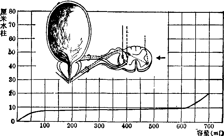 图2 弛张型神经性膀胱 ←: 损害部位,于脊髓反射中枢及以下膀胱测压: 内压低 诊断应首先确定病因。尿动力学检查可了解其类型,检查项目包括膀胱测压、逼尿肌压力、尿流率、尿道压力描图和括约肌肌电图。尚需测定残余尿量,作膀胱尿道造影及膀胱镜检查。 于原发病治愈后,若排尿功能不恢复,可按下列原则治疗,以减少残余尿,预防尿路感染,保护肾脏免受损害。治疗方法如下: 痉挛型: ❶膀胱容量较大者,训练定期排尿。 ❷应用副交感神经阻滞剂如溴本辛、丙咪嗪或双环胺,增加膀胱容量。 ❸膀胱容量小并有输尿管反流者,作骶神经阻滞,阴部神经切除或选择性(骶-3) 神经切除术。 ❹定期导尿。 ❺佩带集尿袋,适用于尿频严重的男孩,以及因残余尿多而施行经尿道膀胱颈切除或外括约肌切开术后的尿失禁者。 弛张型: ❶定期按压下腹部排尿,若失败则定期导尿。 ❷针灸治疗。 ❸使用增强逼尿肌收缩力的拟副交感神经药物,如氨甲酰甲基胆素,也可用苯苄胺将支配膀胱颈和尿道平滑肌的交感神经阻滞,帮助膀胱排空。 ❹电刺激:将电极植入膀胱壁或骶管内,供体外电刺激器的感应,使逼尿肌有效地收缩;可植入的人工括约肌也已设计成功。 ❺膀胱出口阻力增加而药物治疗无效者,可采用尿道扩张术,经尿道膀胱颈切除术或外括约肌切开术,并佩带集尿袋。 神经性膀胱并发泌尿系感染,上尿路逐渐扩张及尿失禁无法控制,应施行尿流改道手术。 ☚ 膀胱外翻 膀胱肿瘤 ☛ |